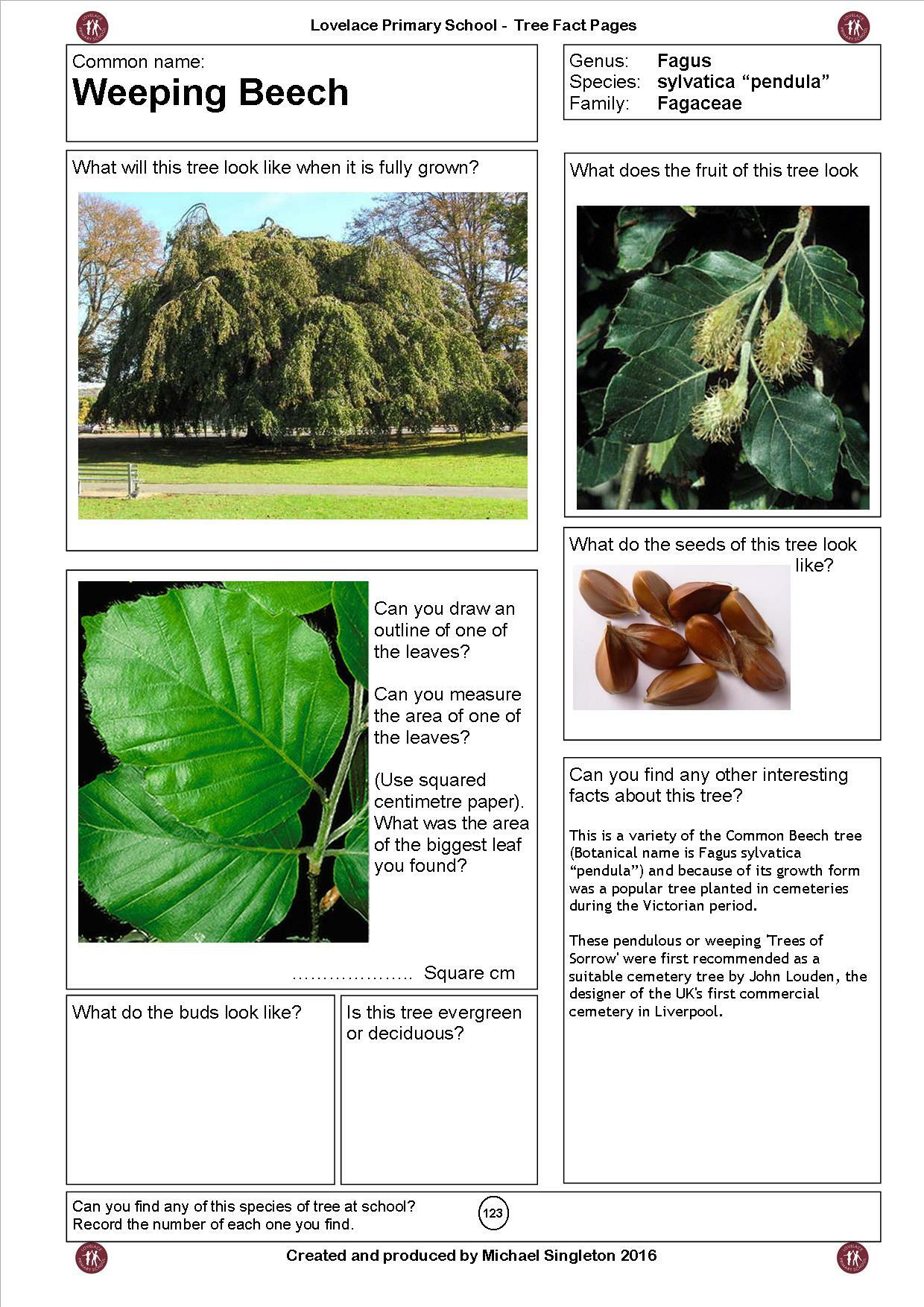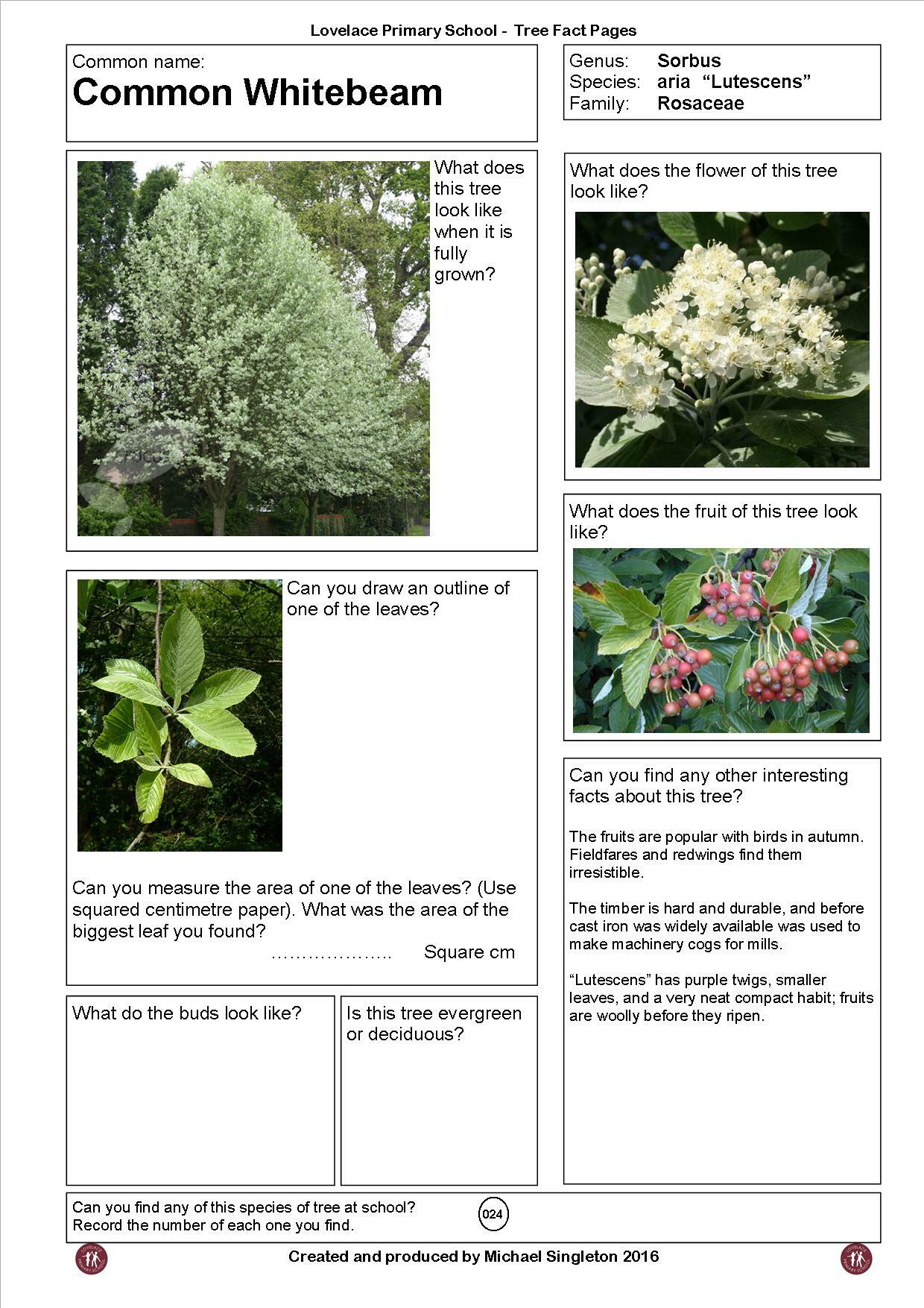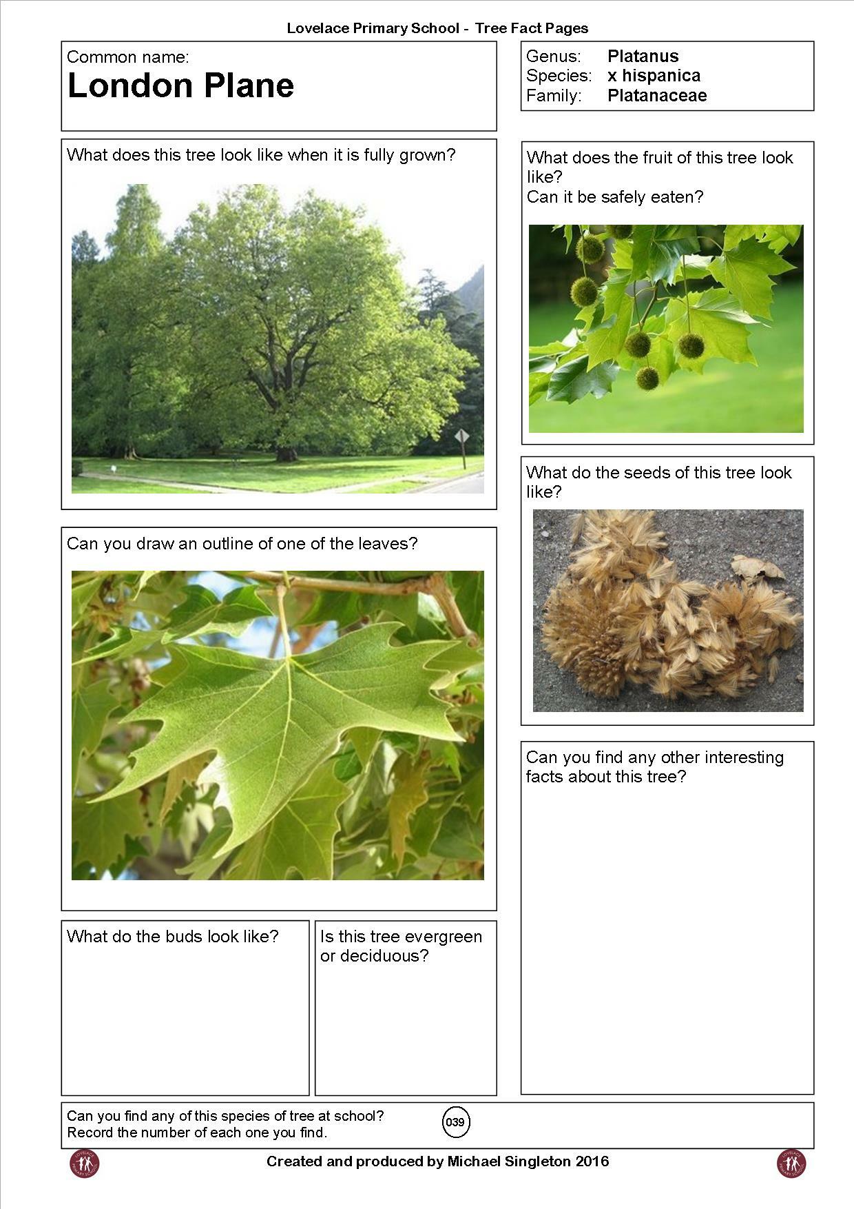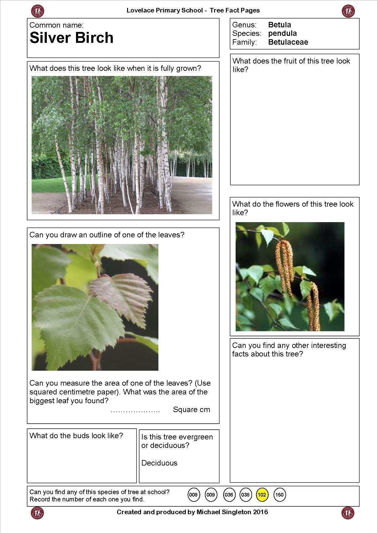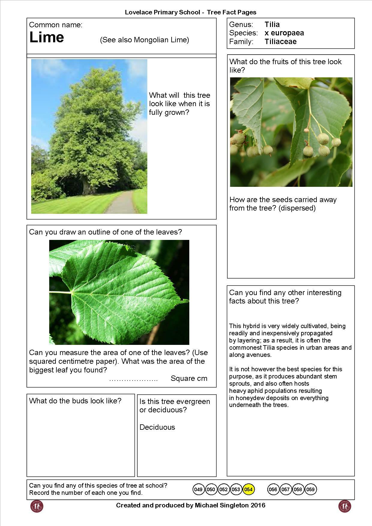 Each tree has been given a unique ID number printed on a white disc fixed to the trunk and the lists and map are kept updated in school by the premises manager. As a preview of this project we have listed a number of images of the fact pages children use as part of their outdoor learning.