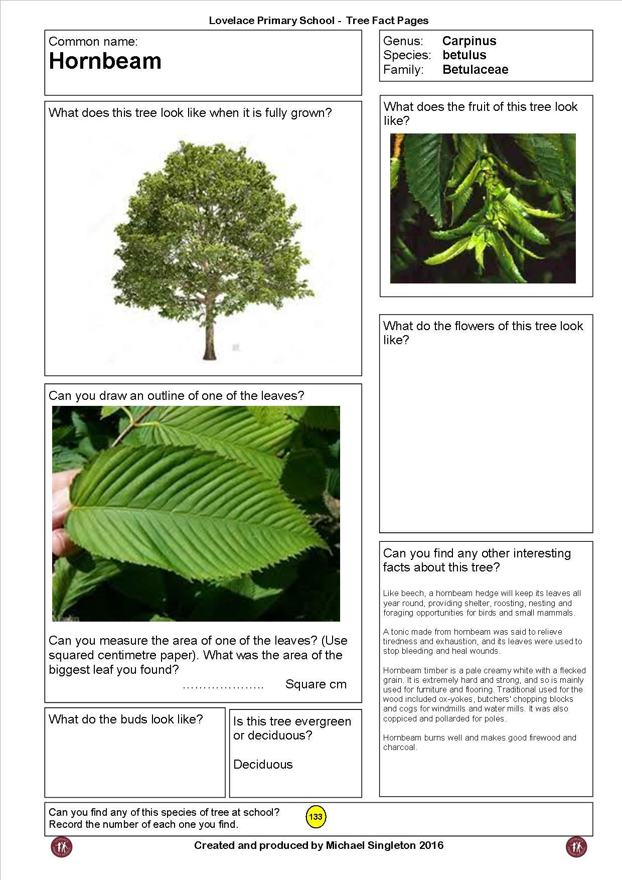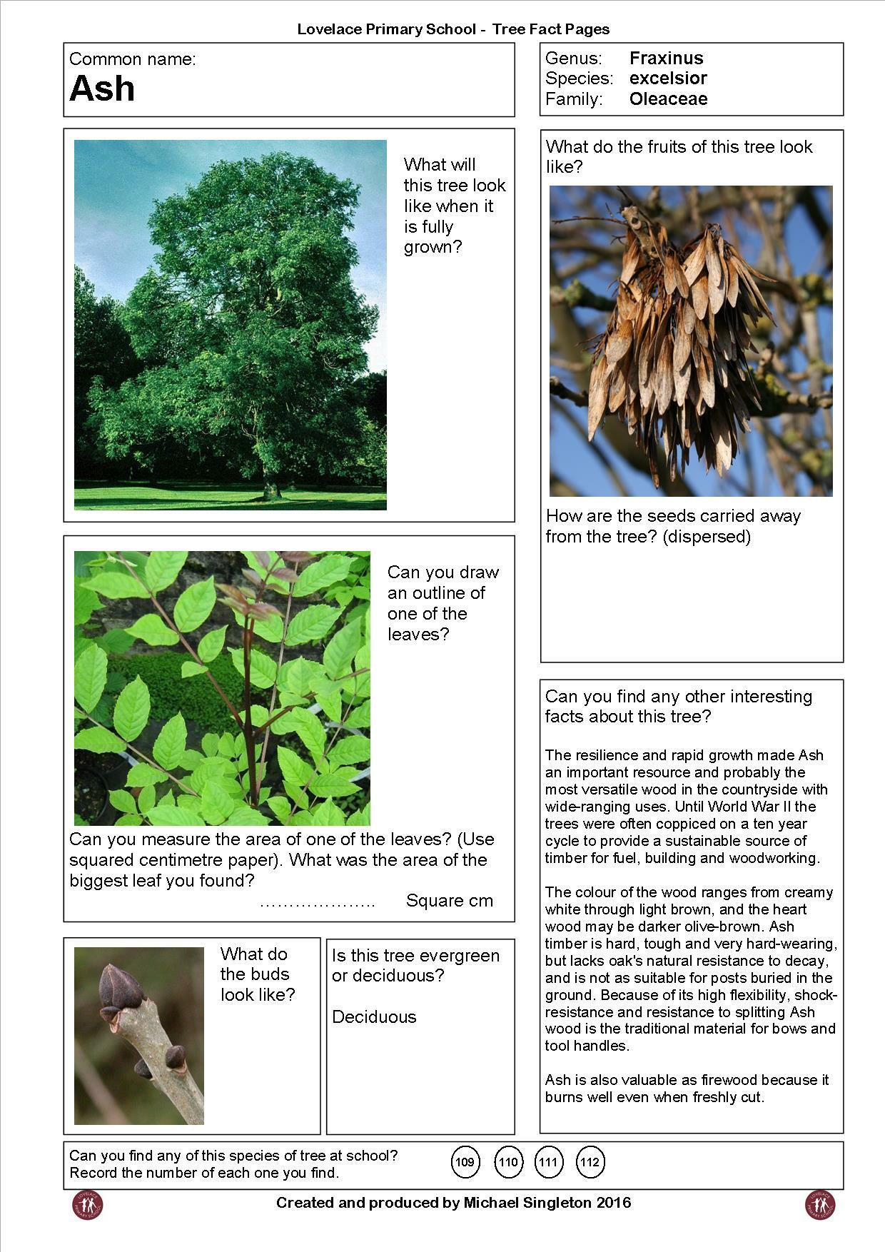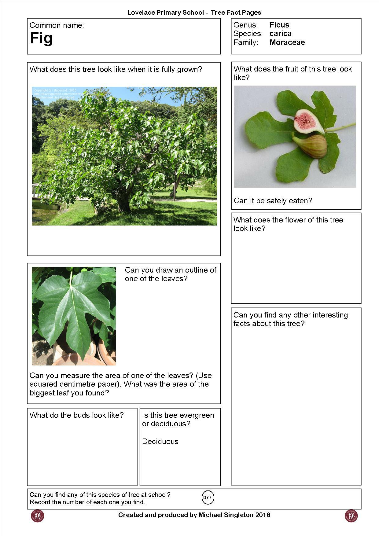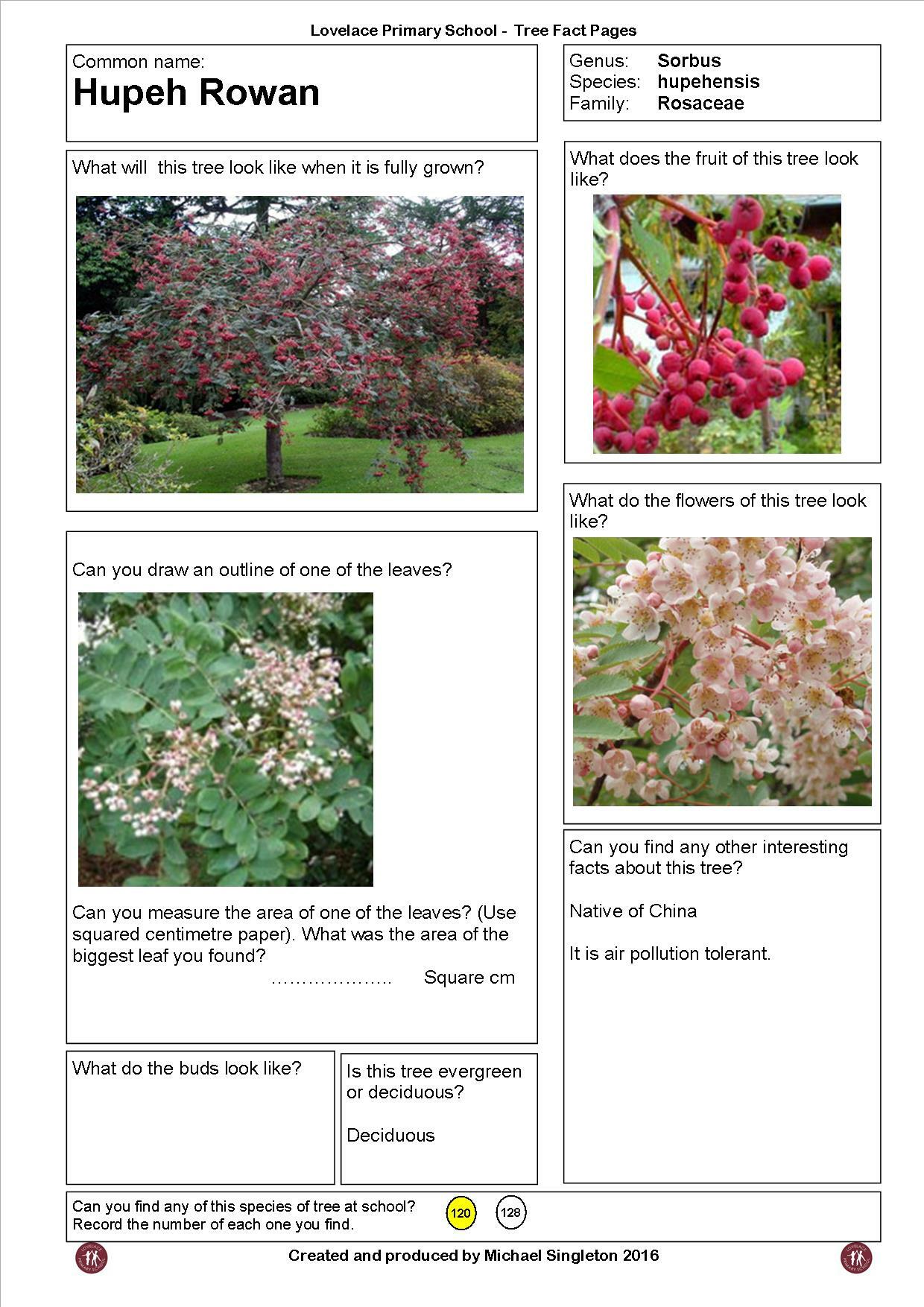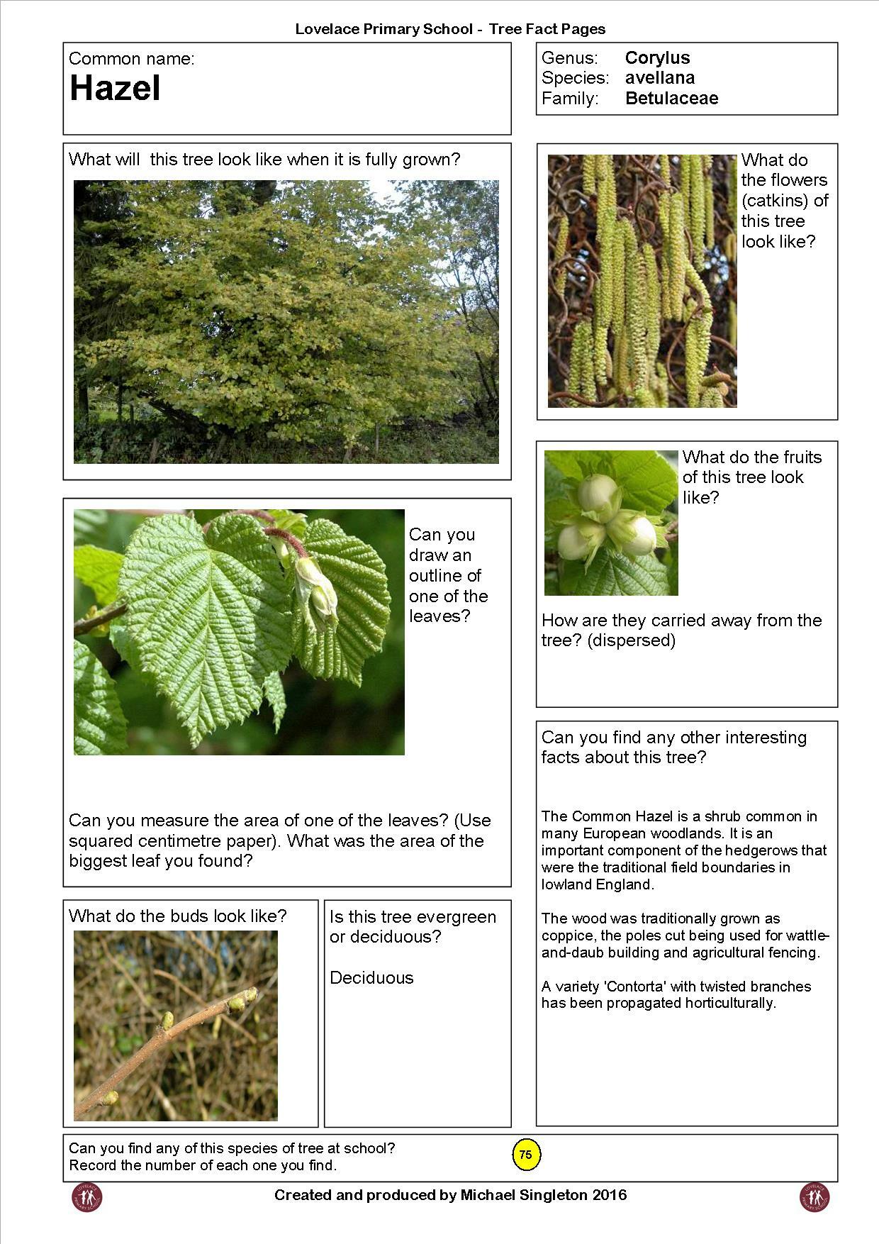 Each tree has been given a unique ID number printed on a white disc fixed to the trunk and the lists and map are kept updated in school by the premises manager. As a preview of this project we have listed a number of images of the fact pages children use as part of their outdoor learning.