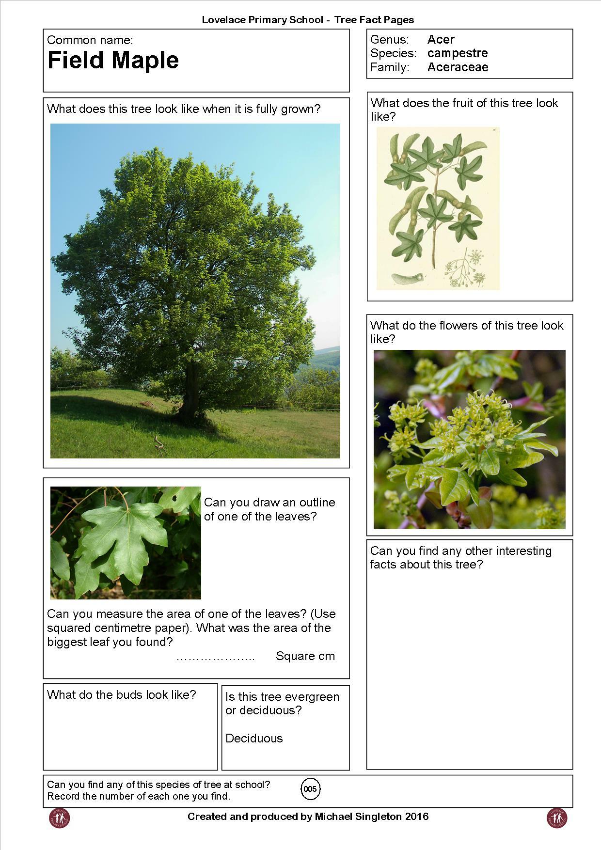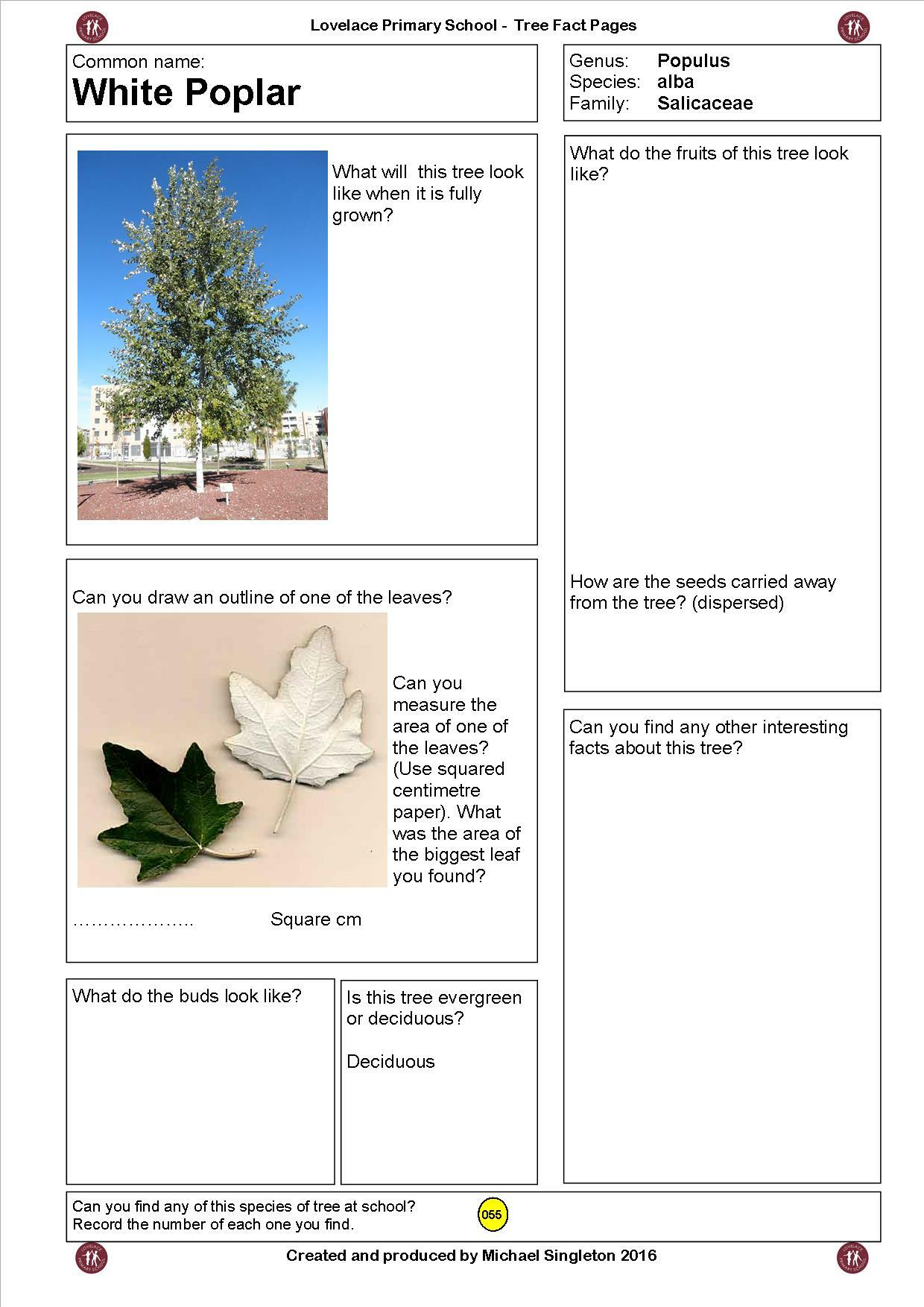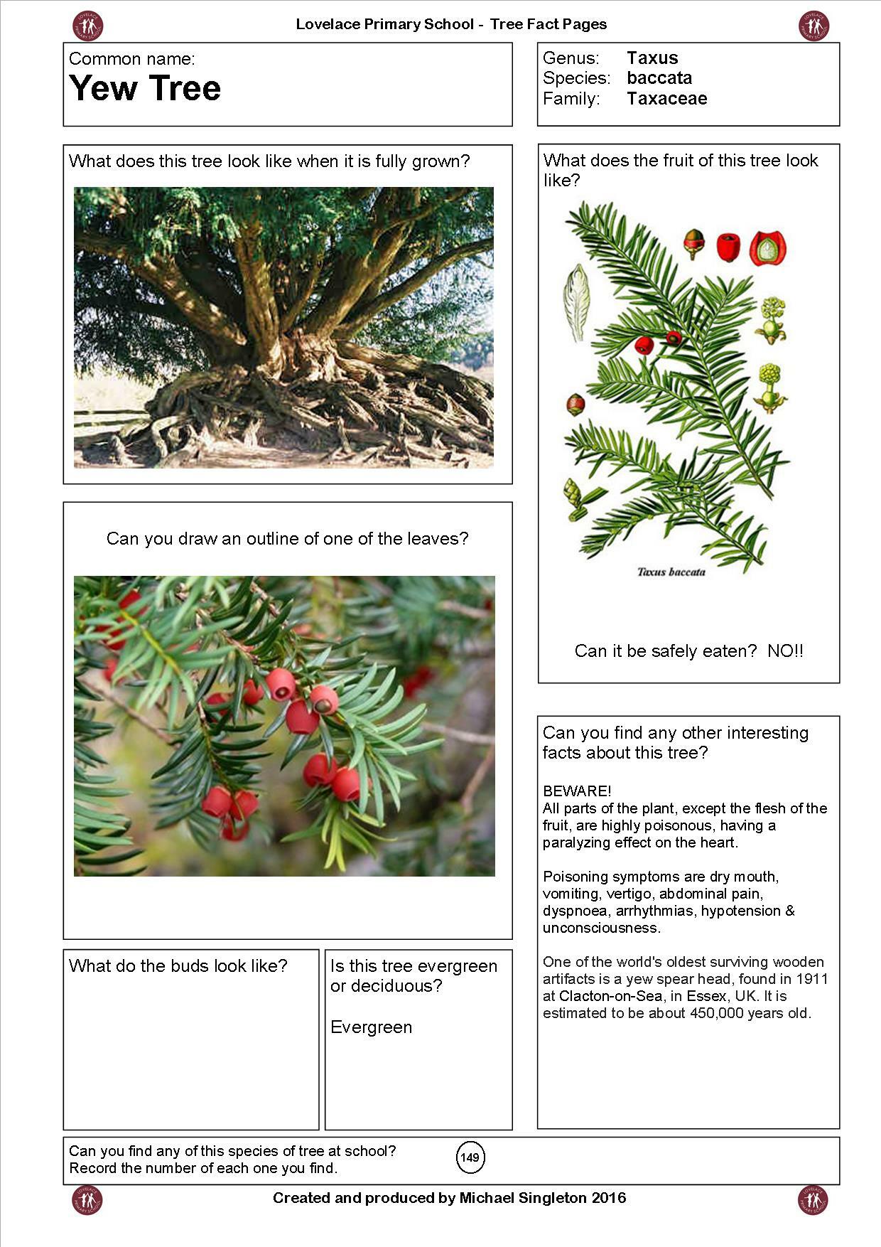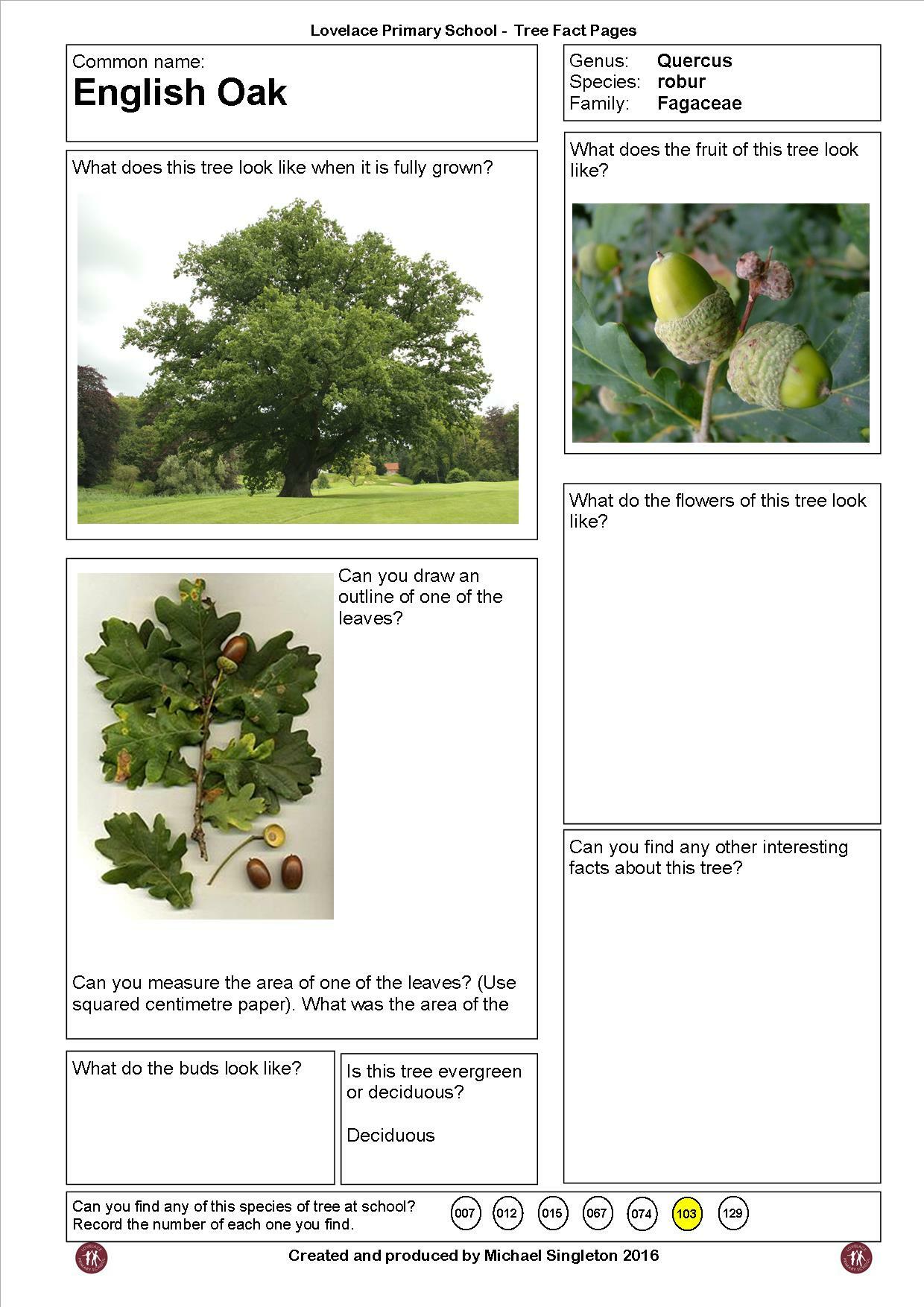 Each tree has been given a unique ID number printed on a white disc fixed to the trunk and the lists and map are kept updated in school by the premises manager. As a preview of this project we have listed a number of images of the fact pages children use as part of their outdoor learning.