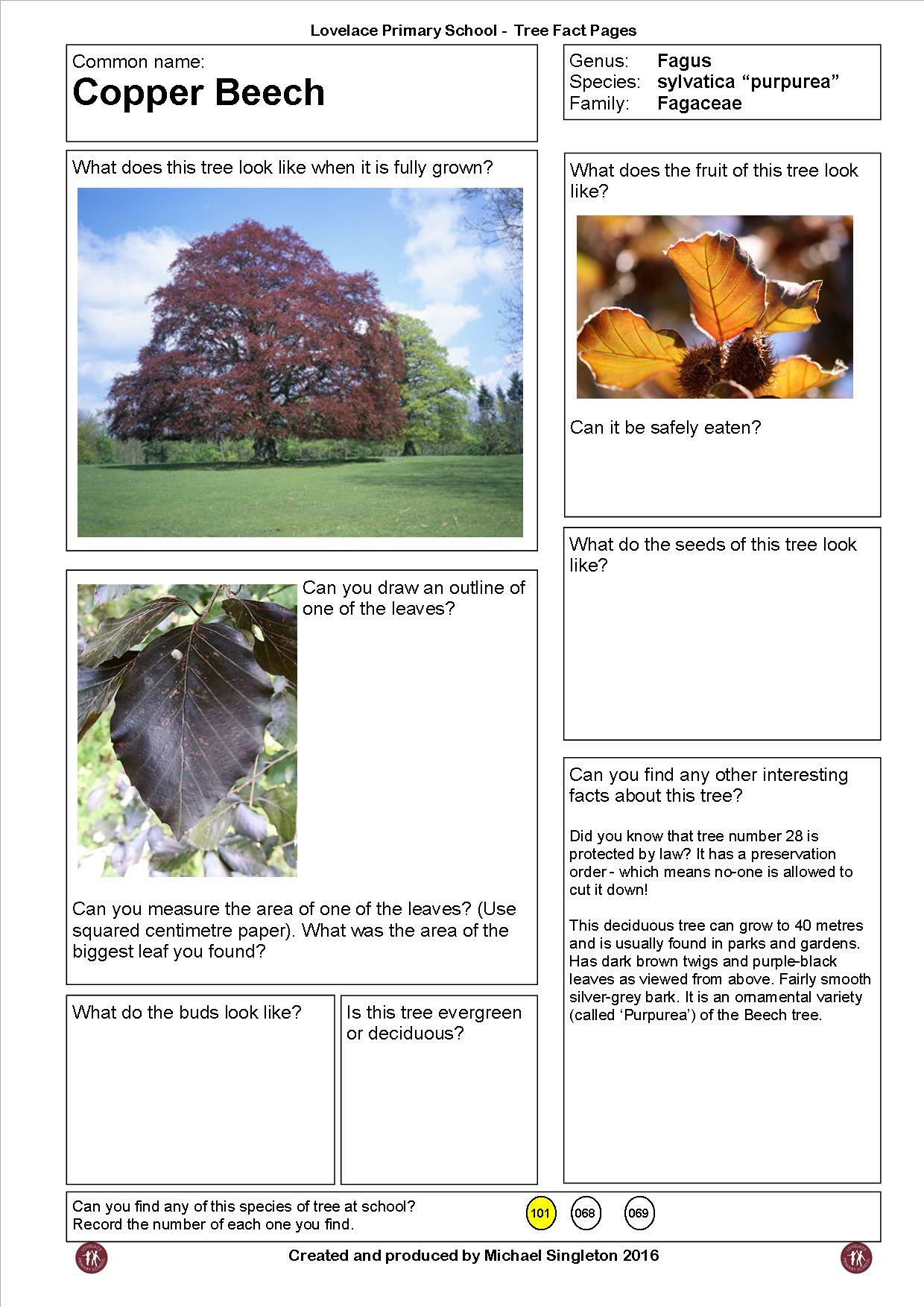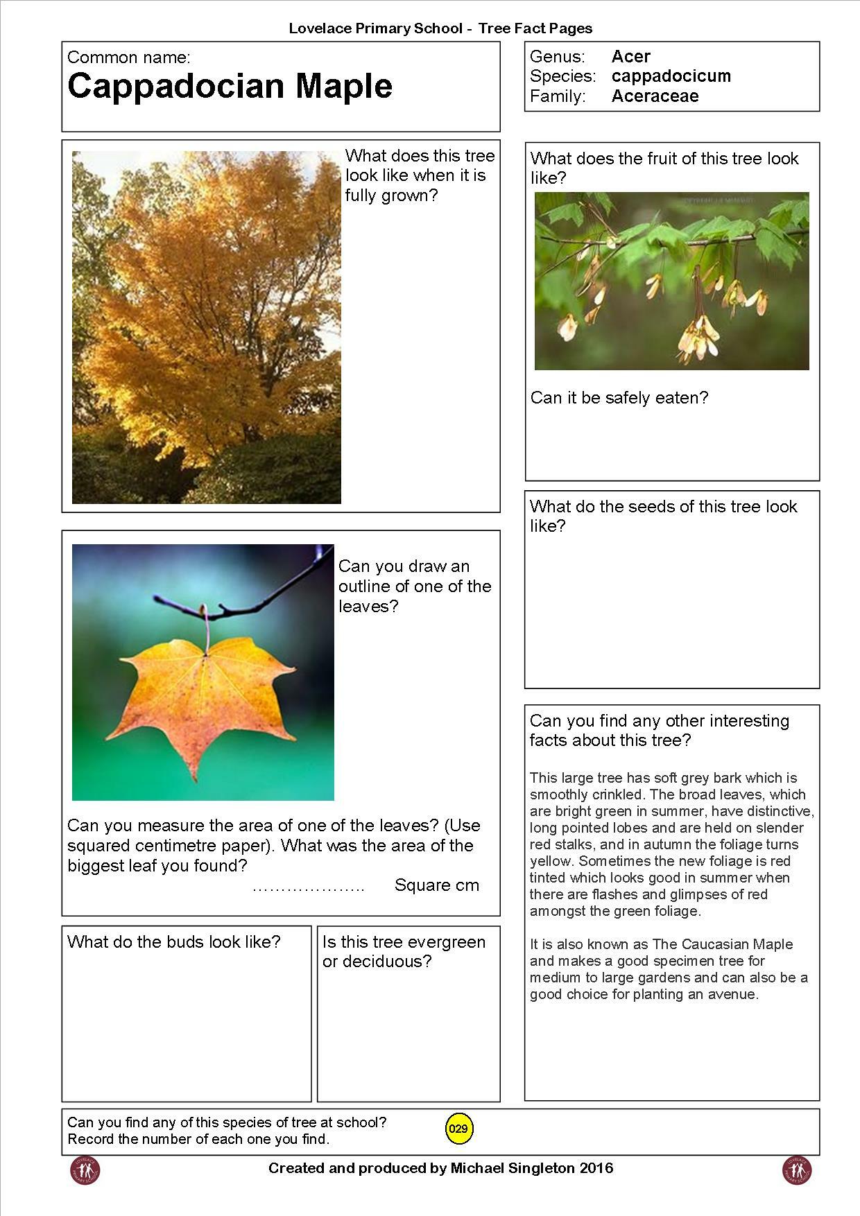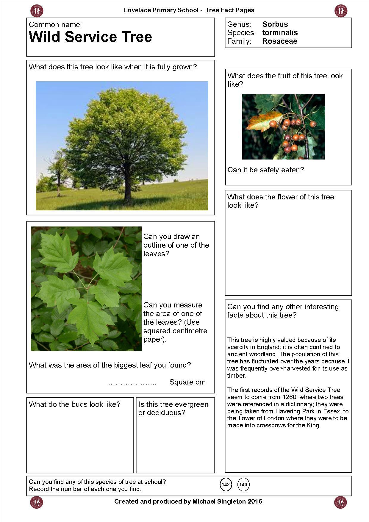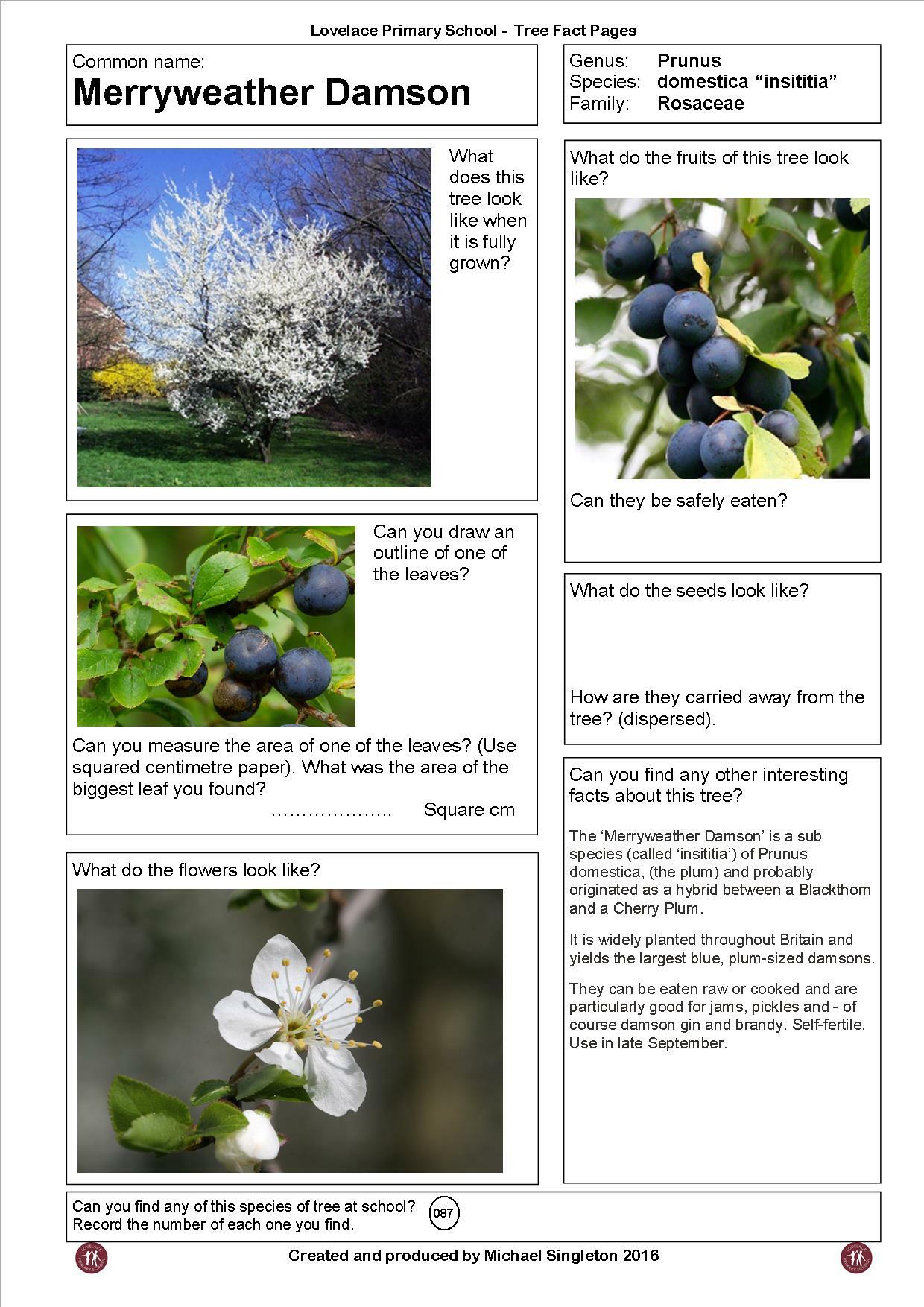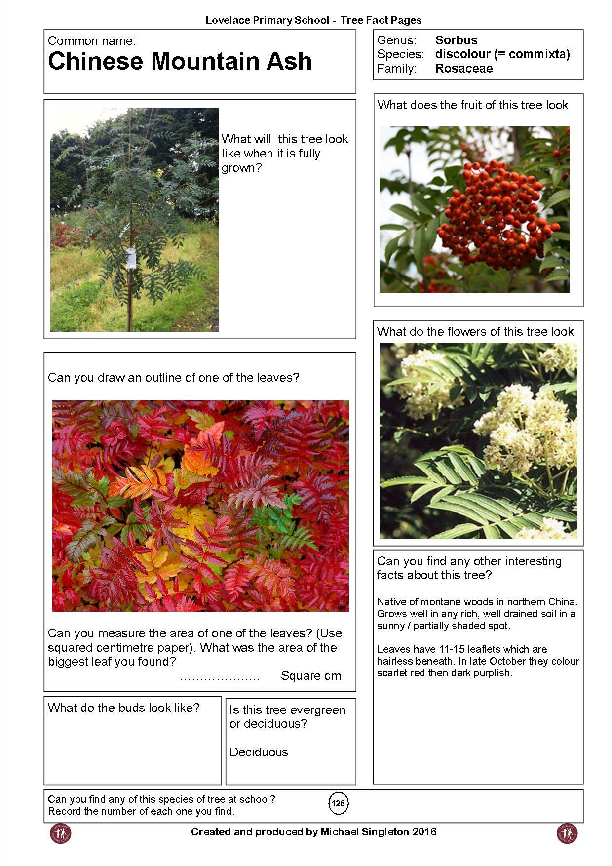 Each tree has been given a unique ID number printed on a white disc fixed to the trunk and the lists and map are kept updated in school by the premises manager. As a preview of this project we have listed a number of images of the fact pages children use as part of their outdoor learning.