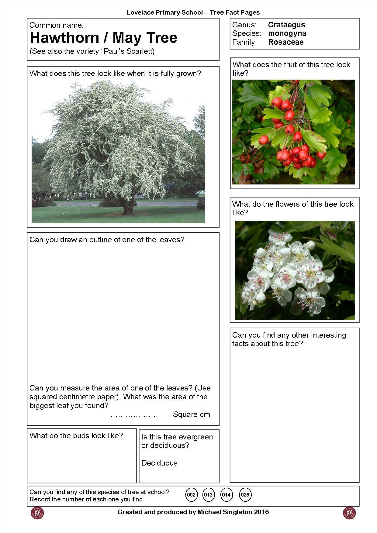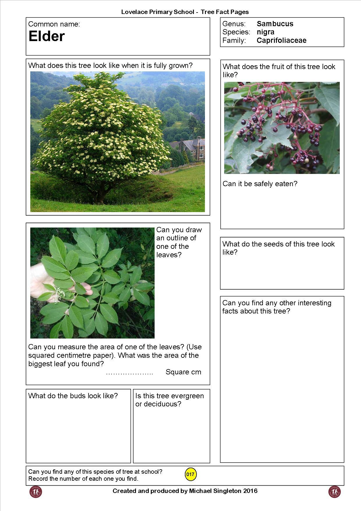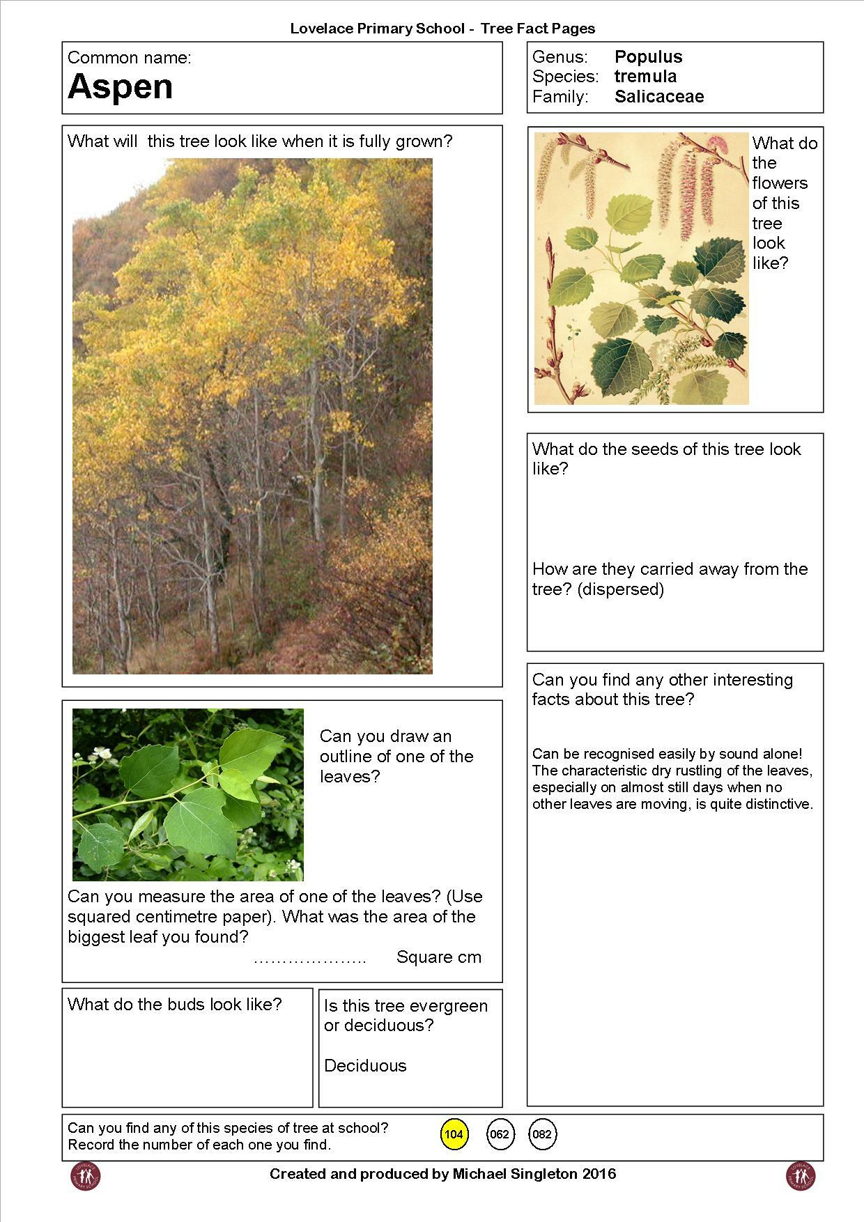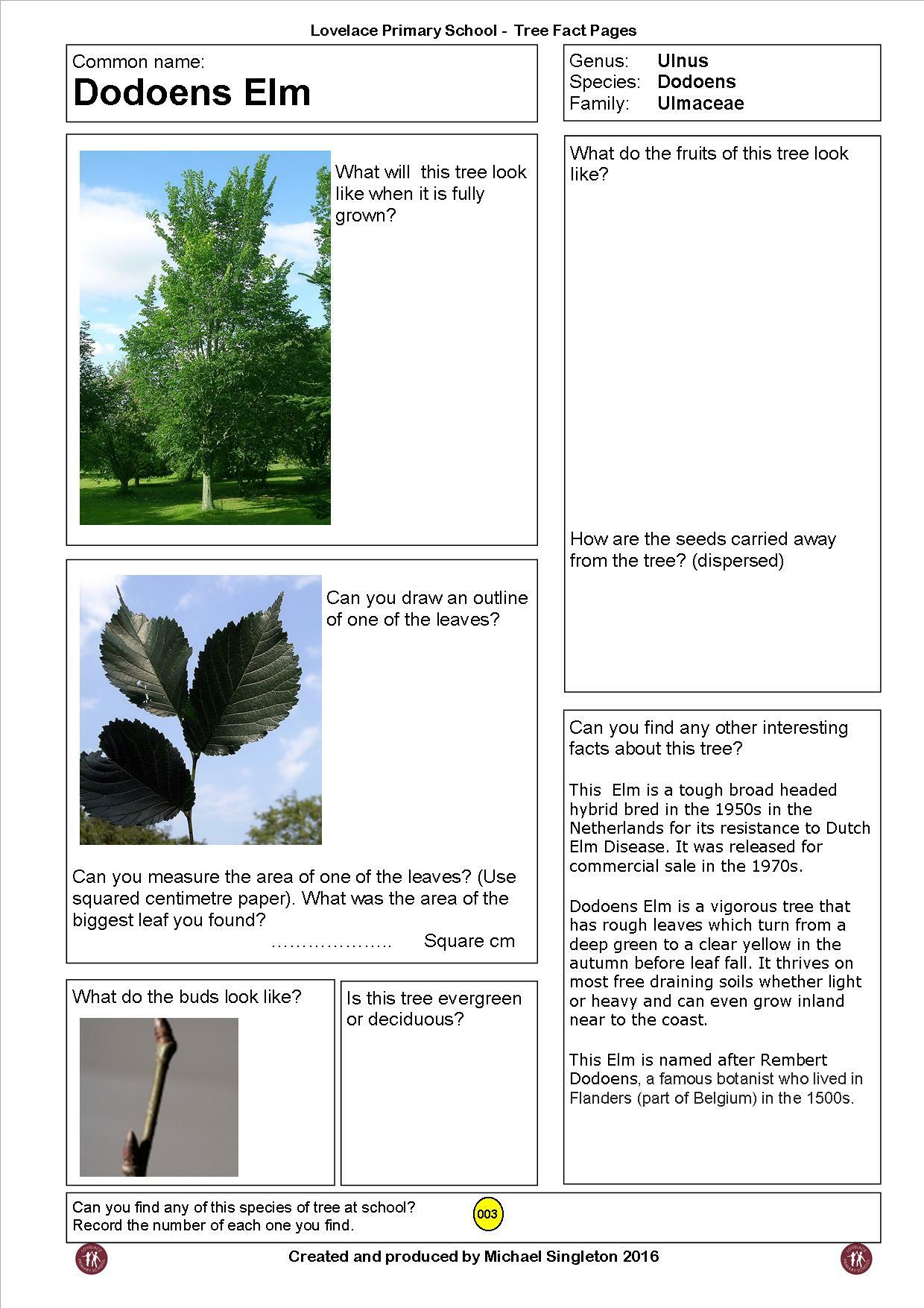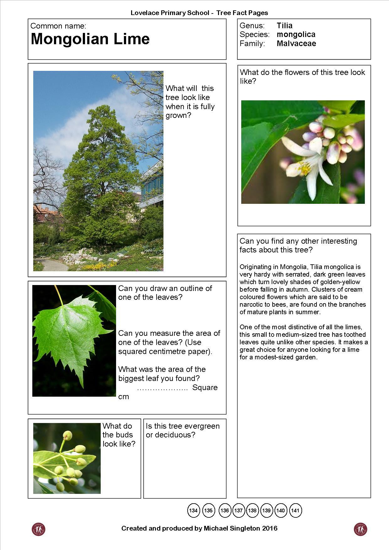 Each tree has been given a unique ID number printed on a white disc fixed to the trunk and the lists and map are kept updated in school by the premises manager. As a preview of this project we have listed a number of images of the fact pages children use as part of their outdoor learning.