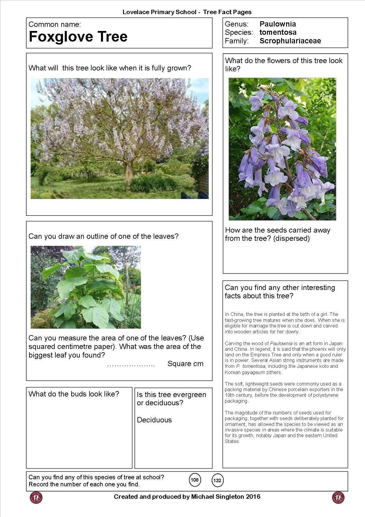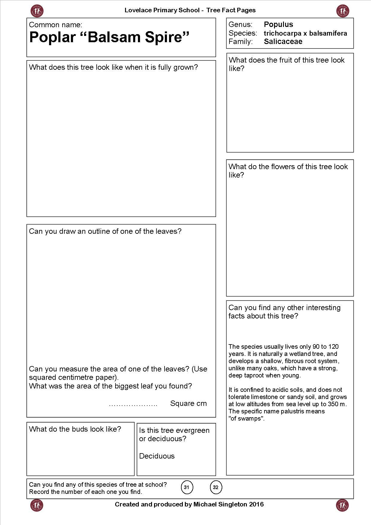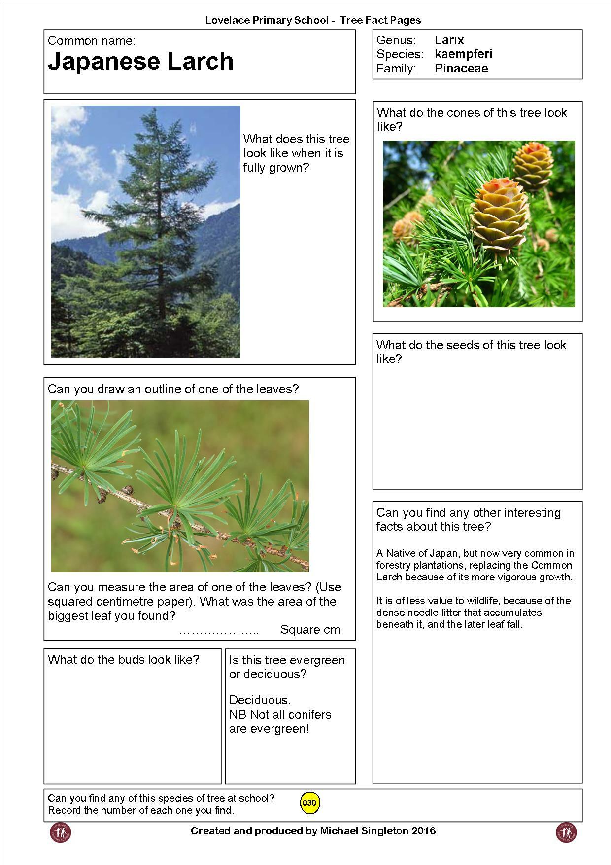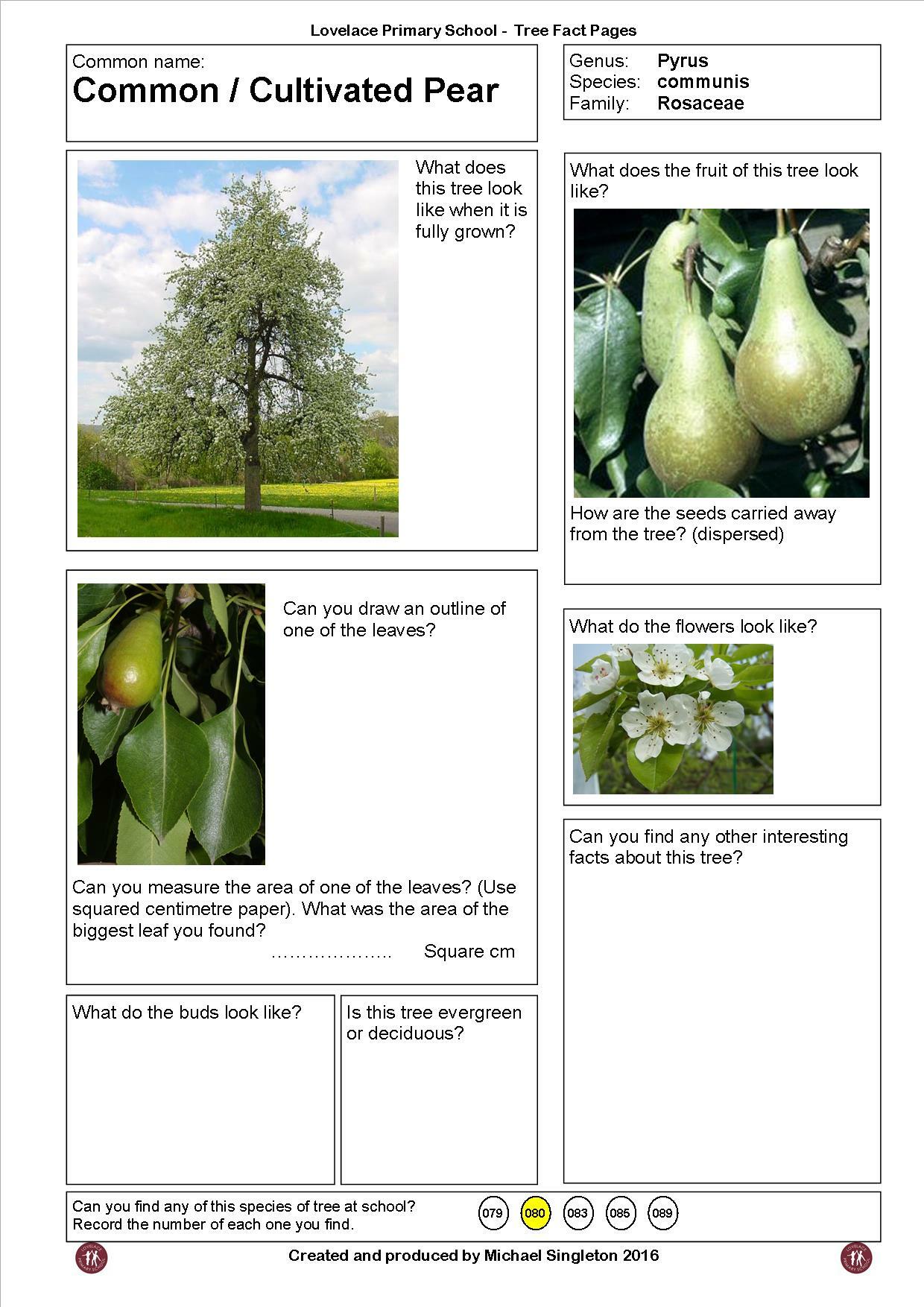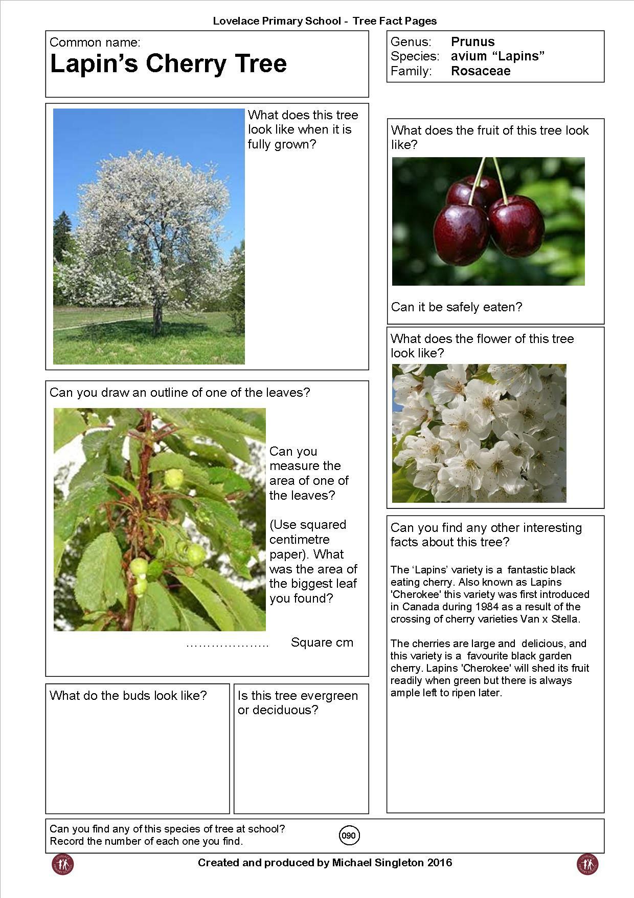 Each tree has been given a unique ID number printed on a white disc fixed to the trunk and the lists and map are kept updated in school by the premises manager. As a preview of this project we have listed a number of images of the fact pages children use as part of their outdoor learning.