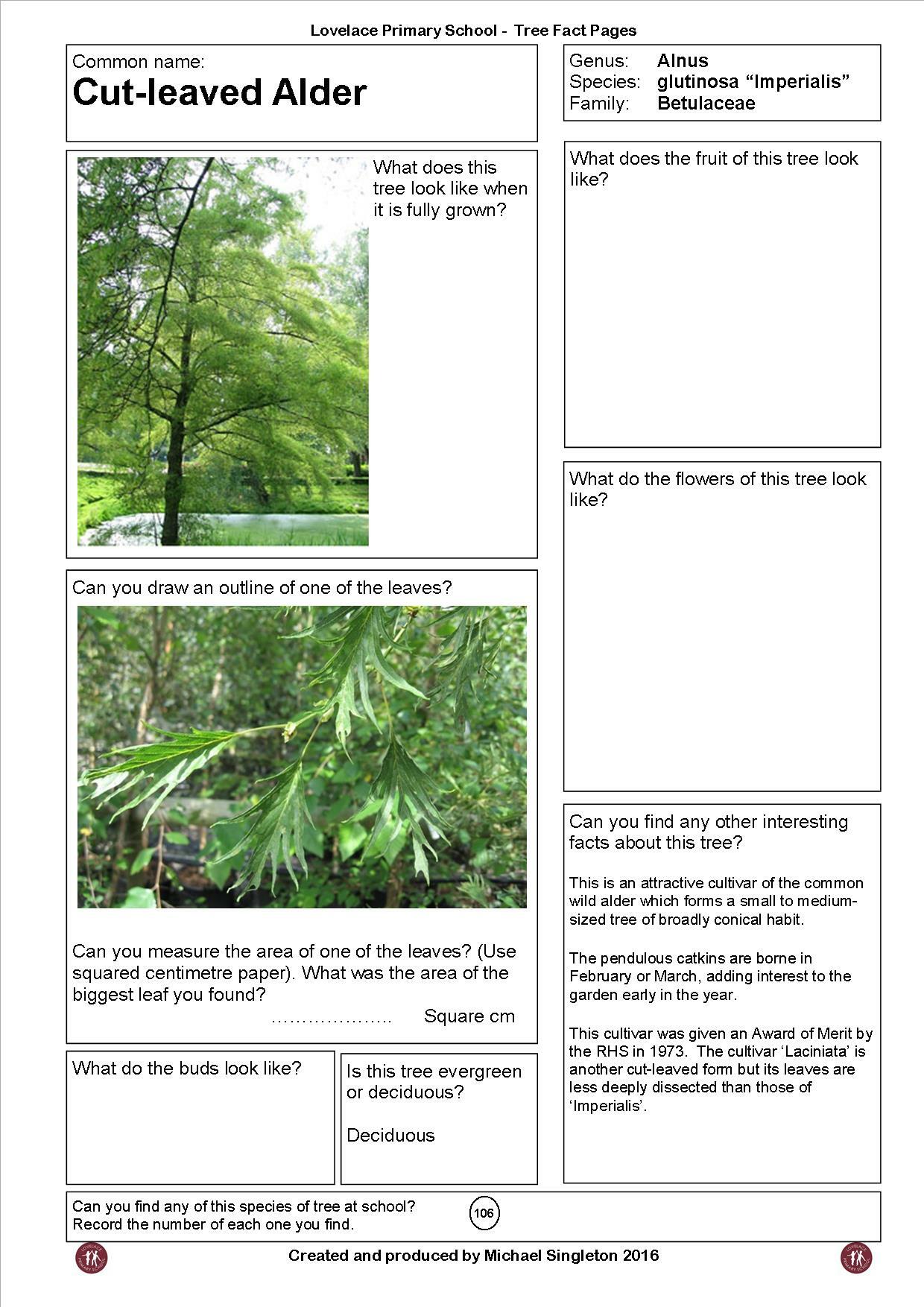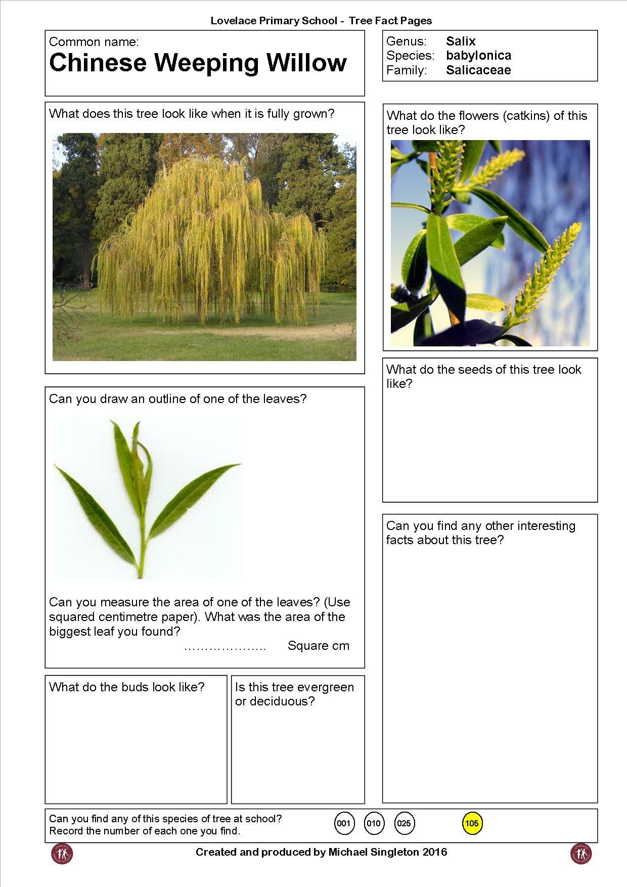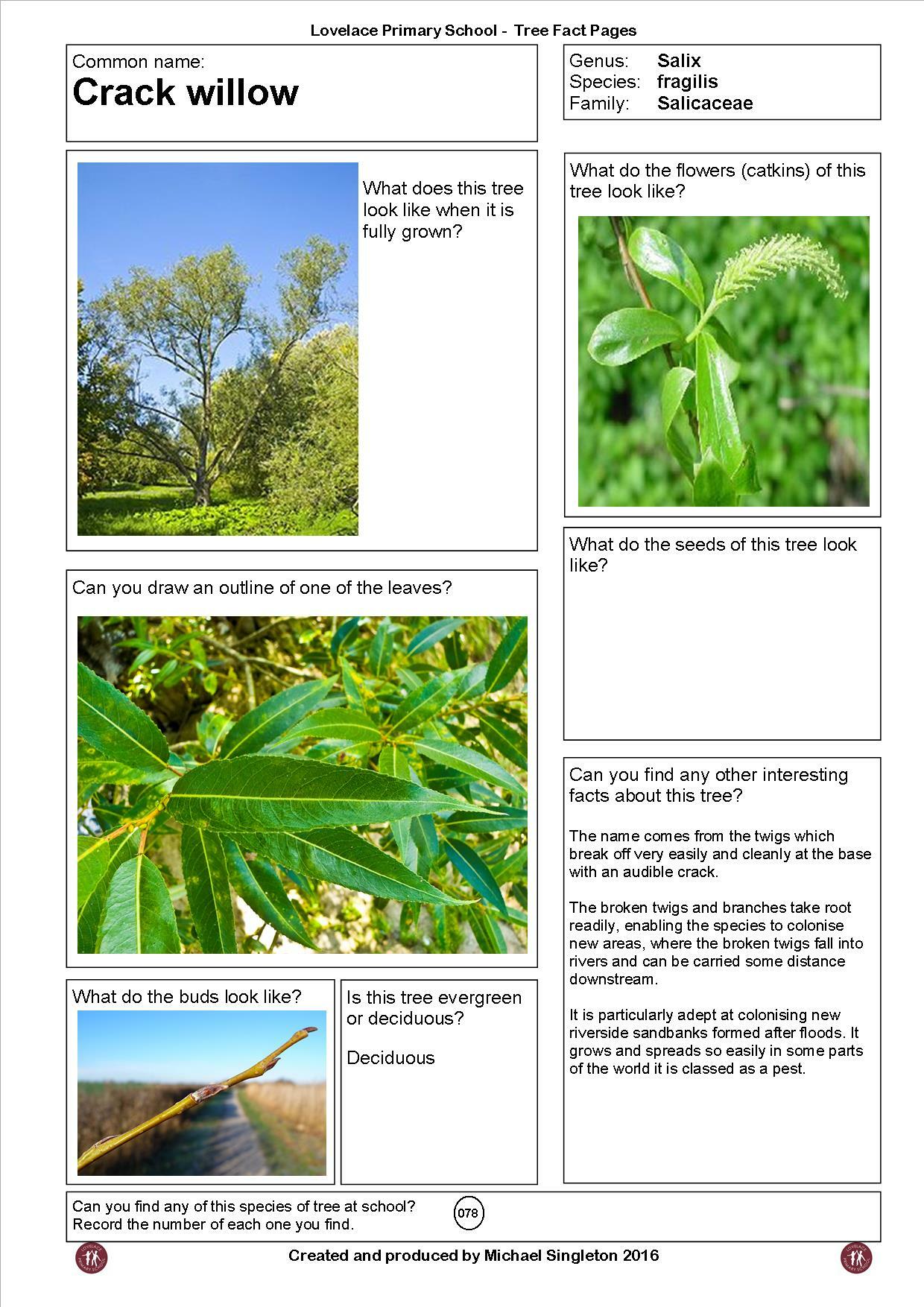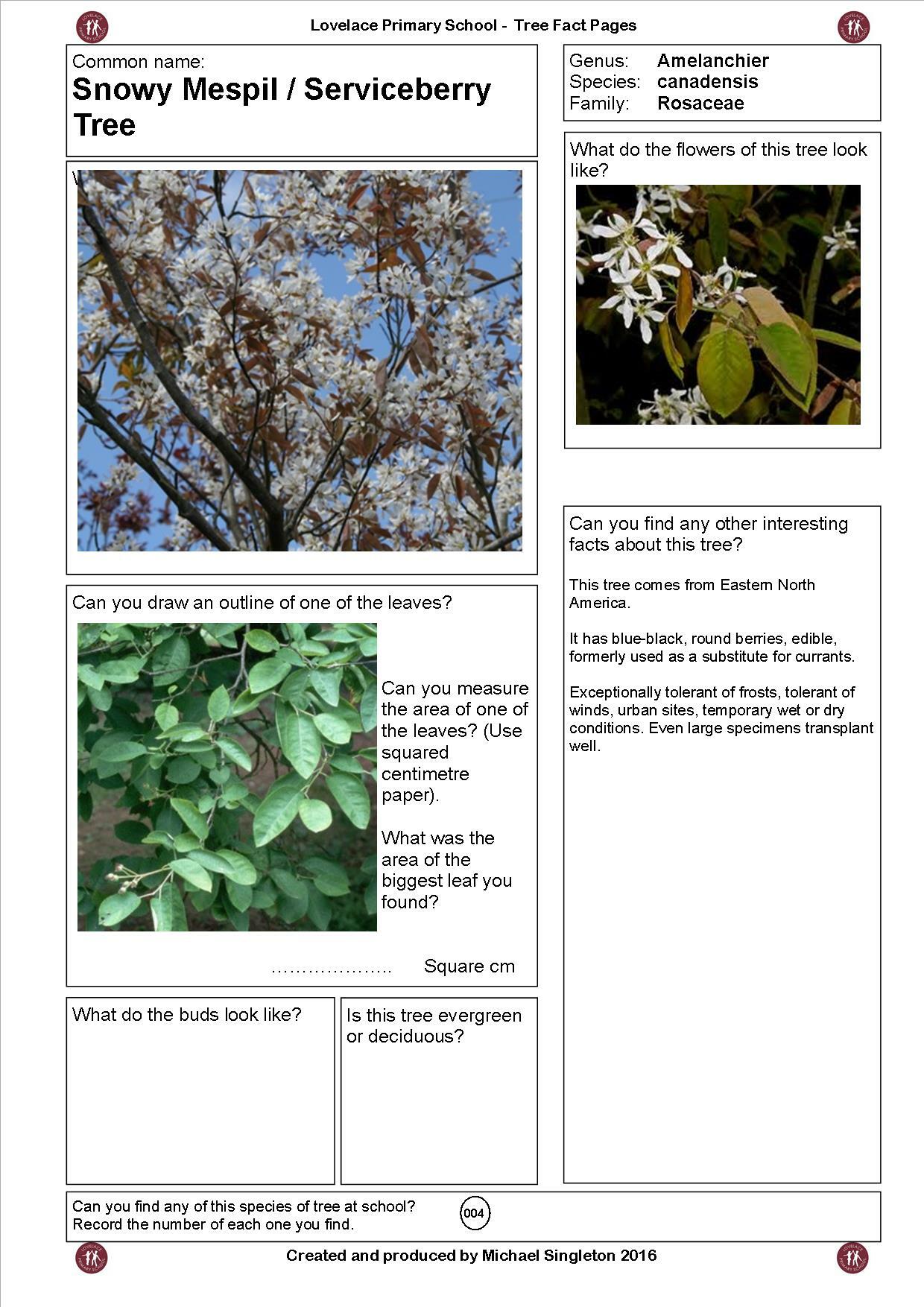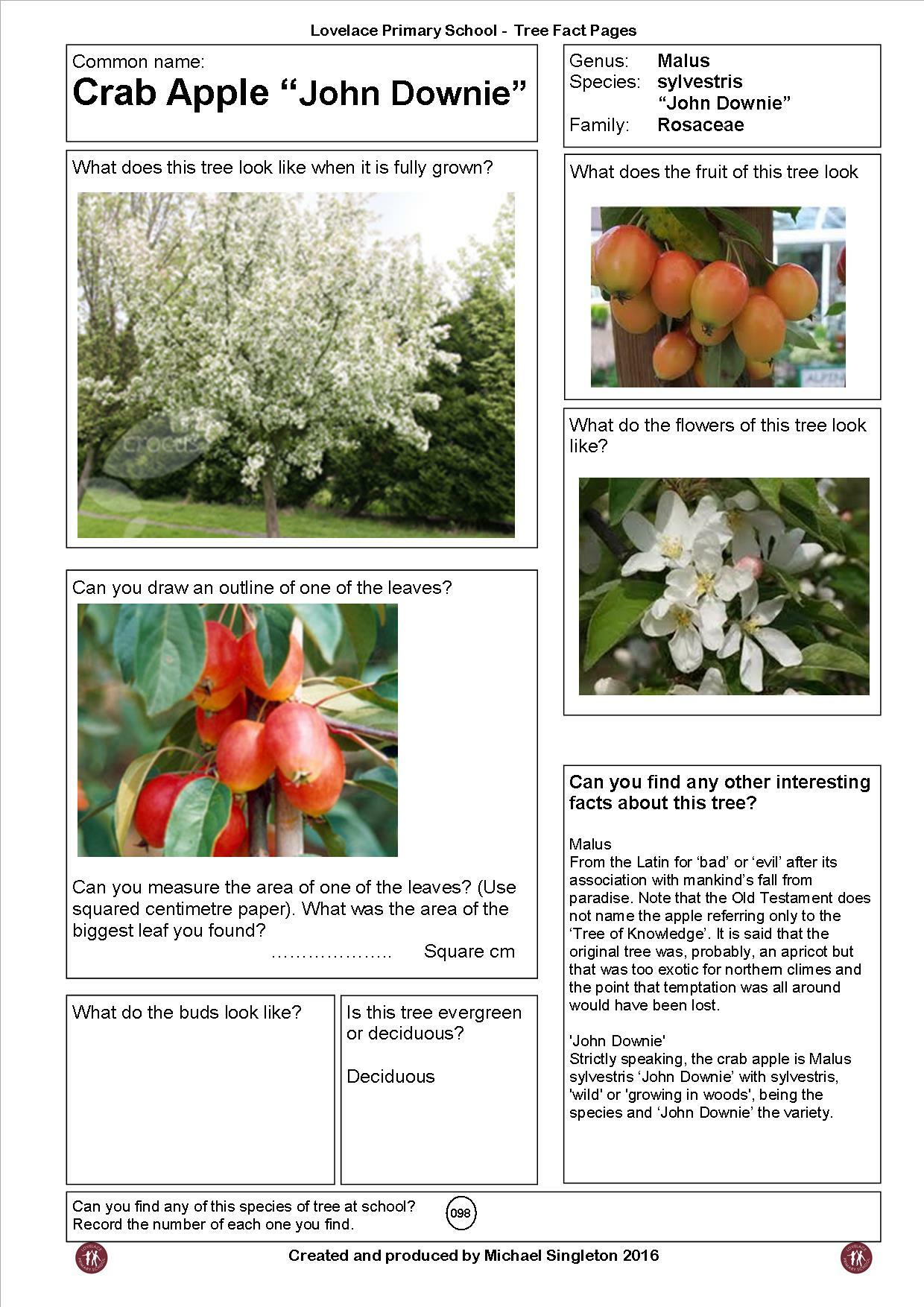 Each tree has been given a unique ID number printed on a white disc fixed to the trunk and the lists and map are kept updated in school by the premises manager. As a preview of this project we have listed a number of images of the fact pages children use as part of their outdoor learning.