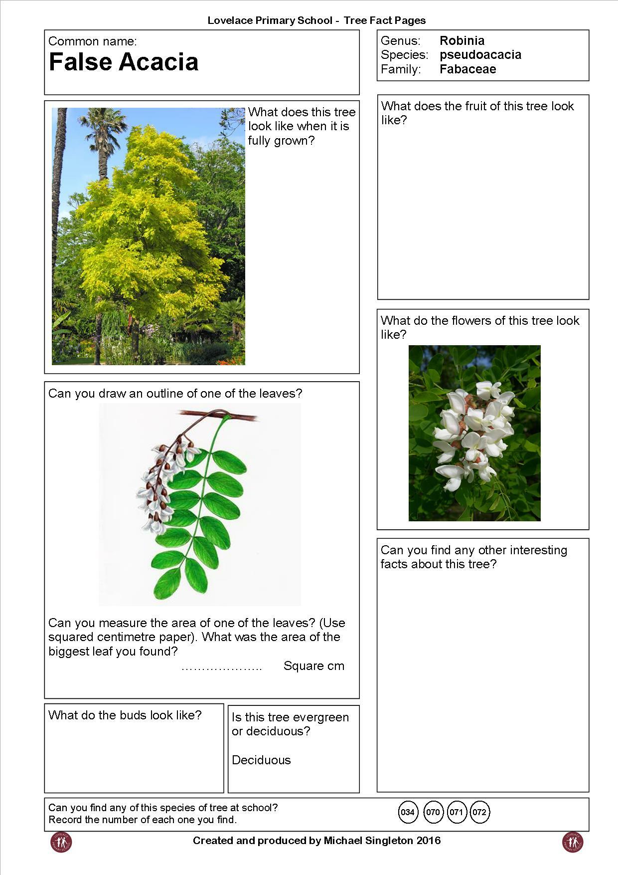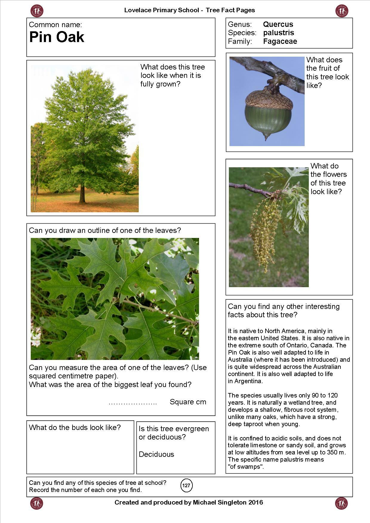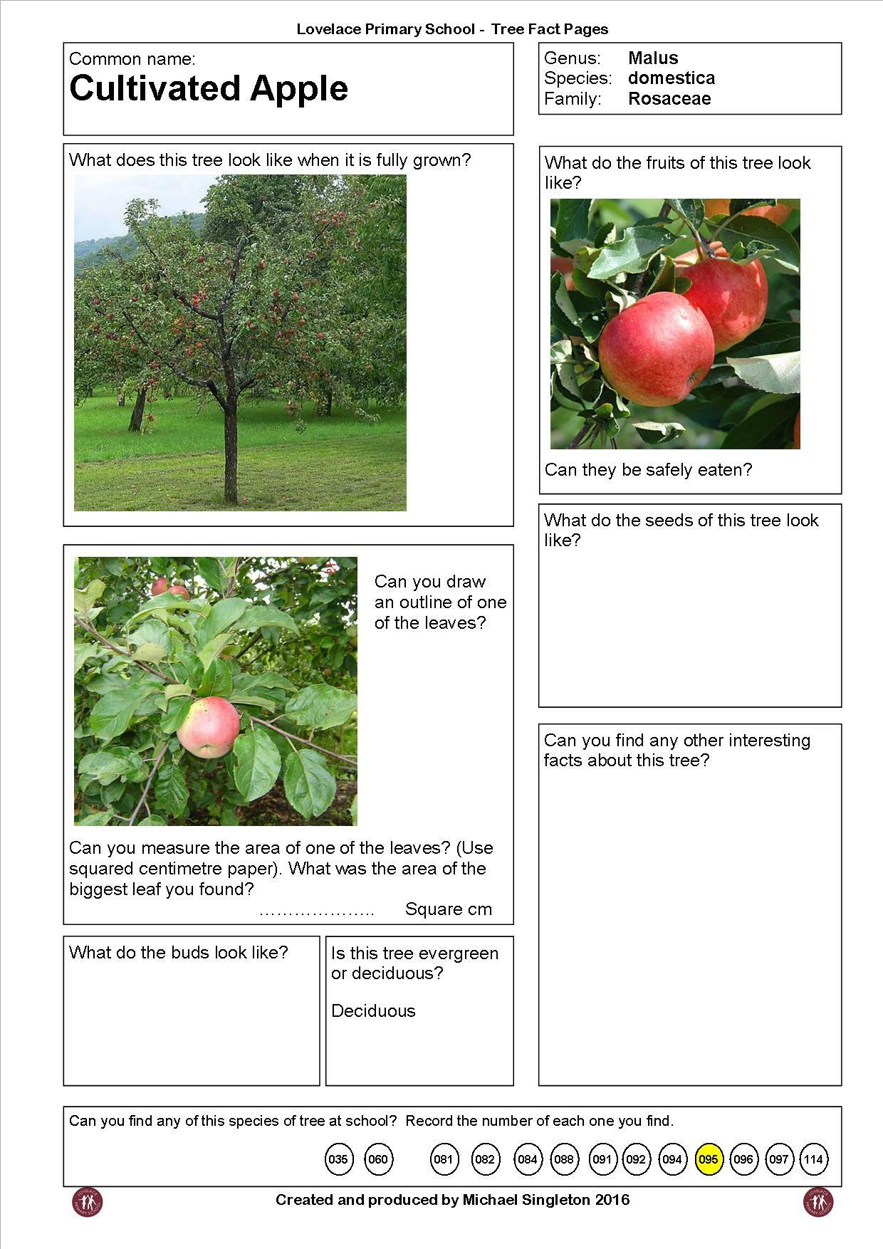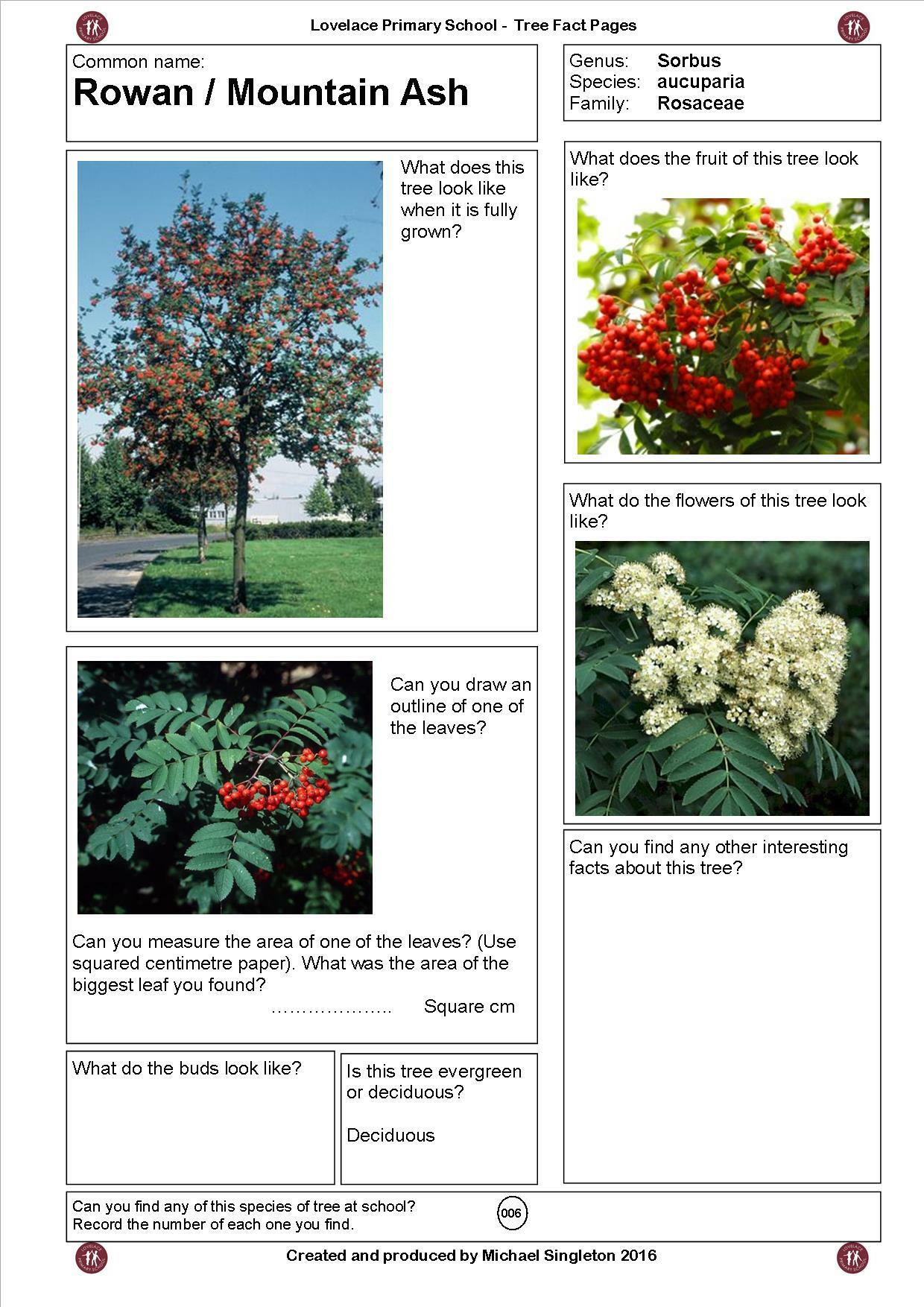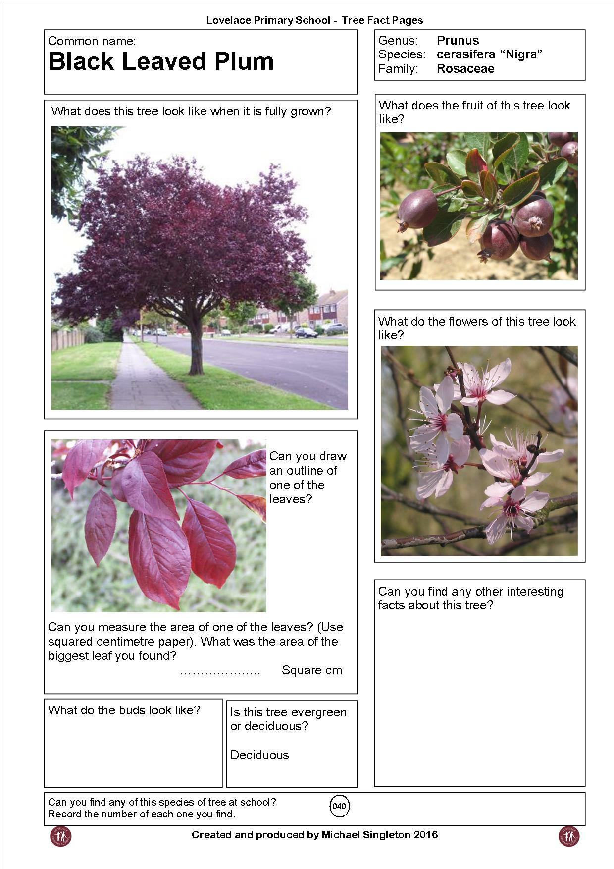 Each tree has been given a unique ID number printed on a white disc fixed to the trunk and the lists and map are kept updated in school by the premises manager. As a preview of this project we have listed a number of images of the fact pages children use as part of their outdoor learning.