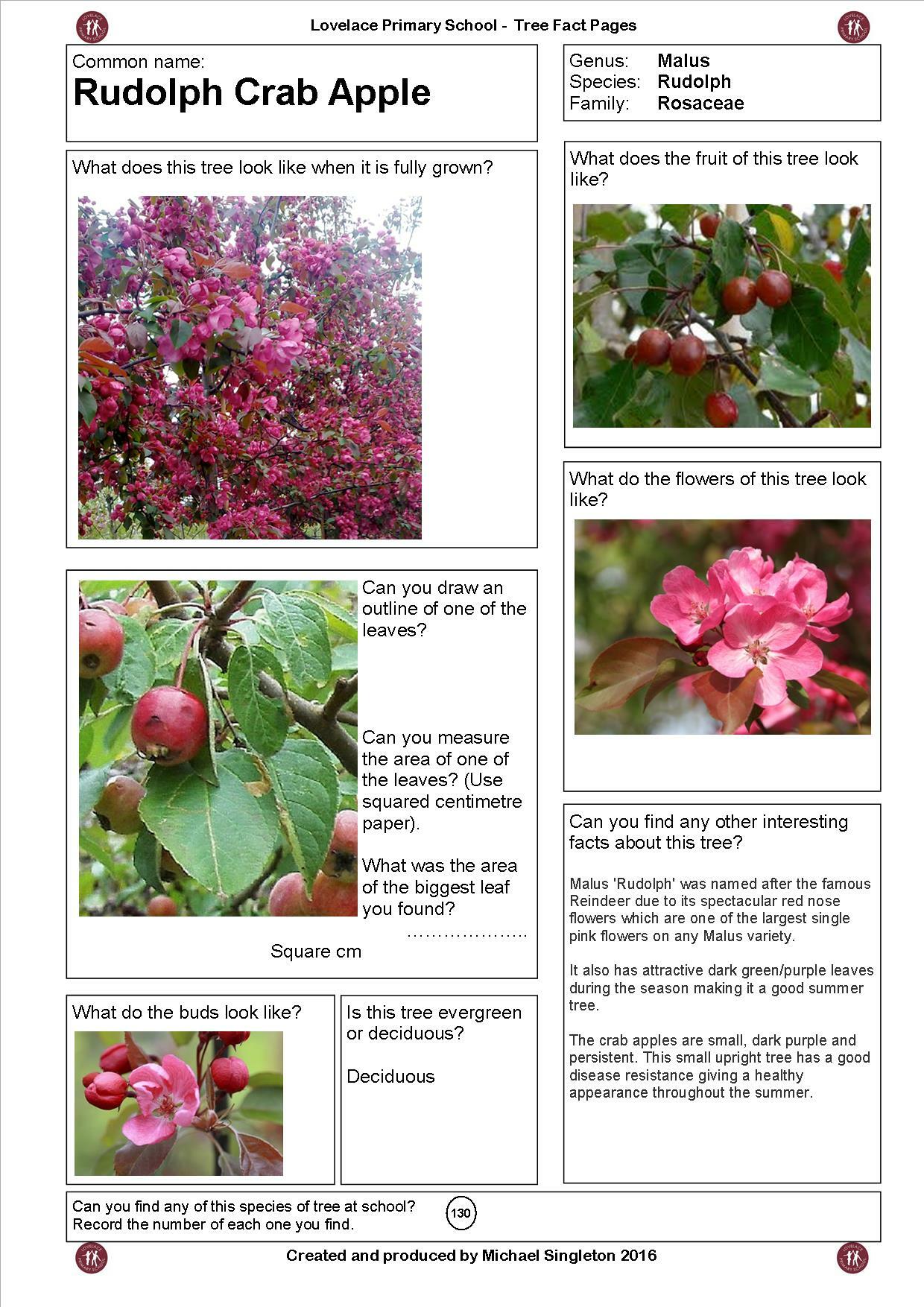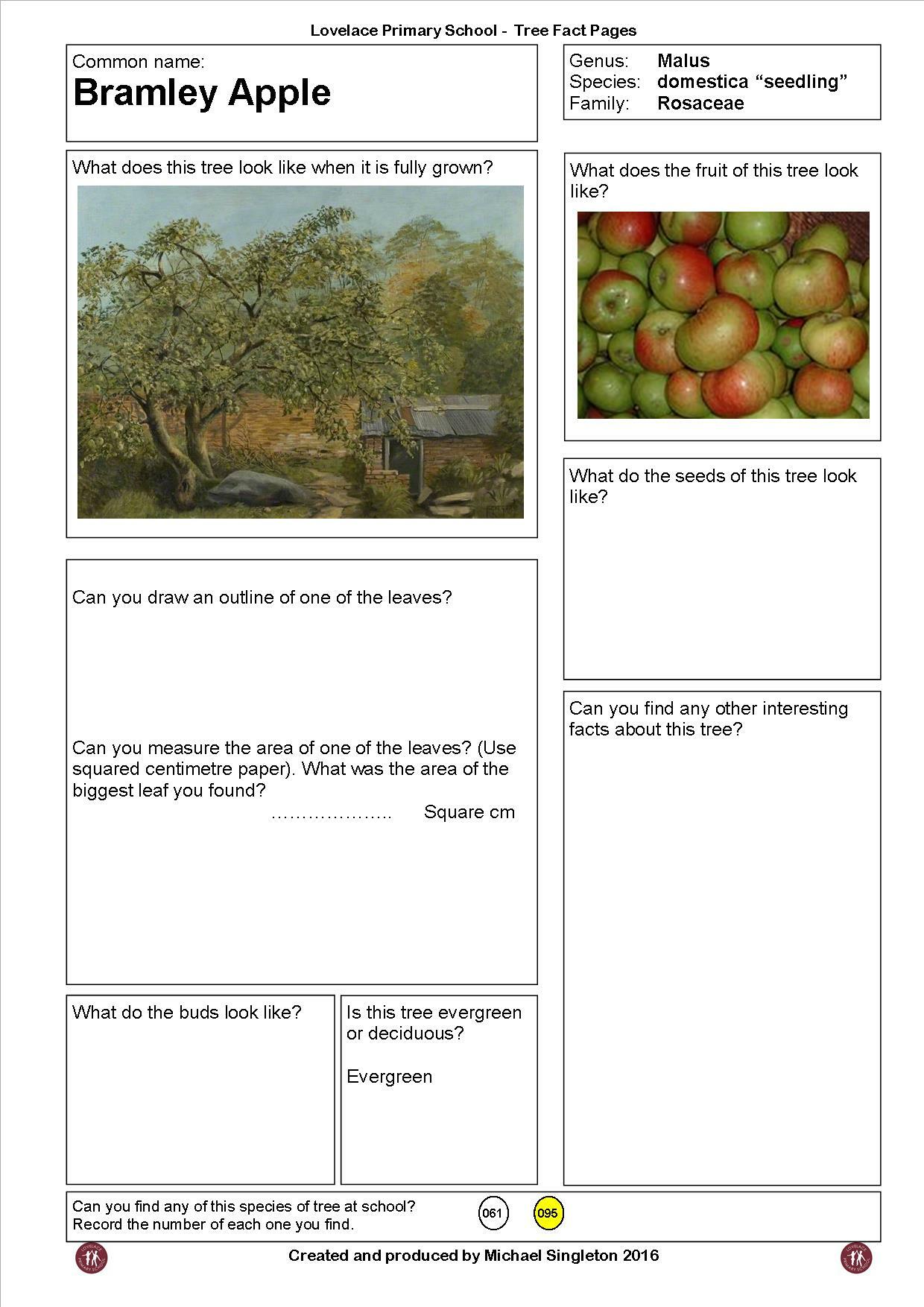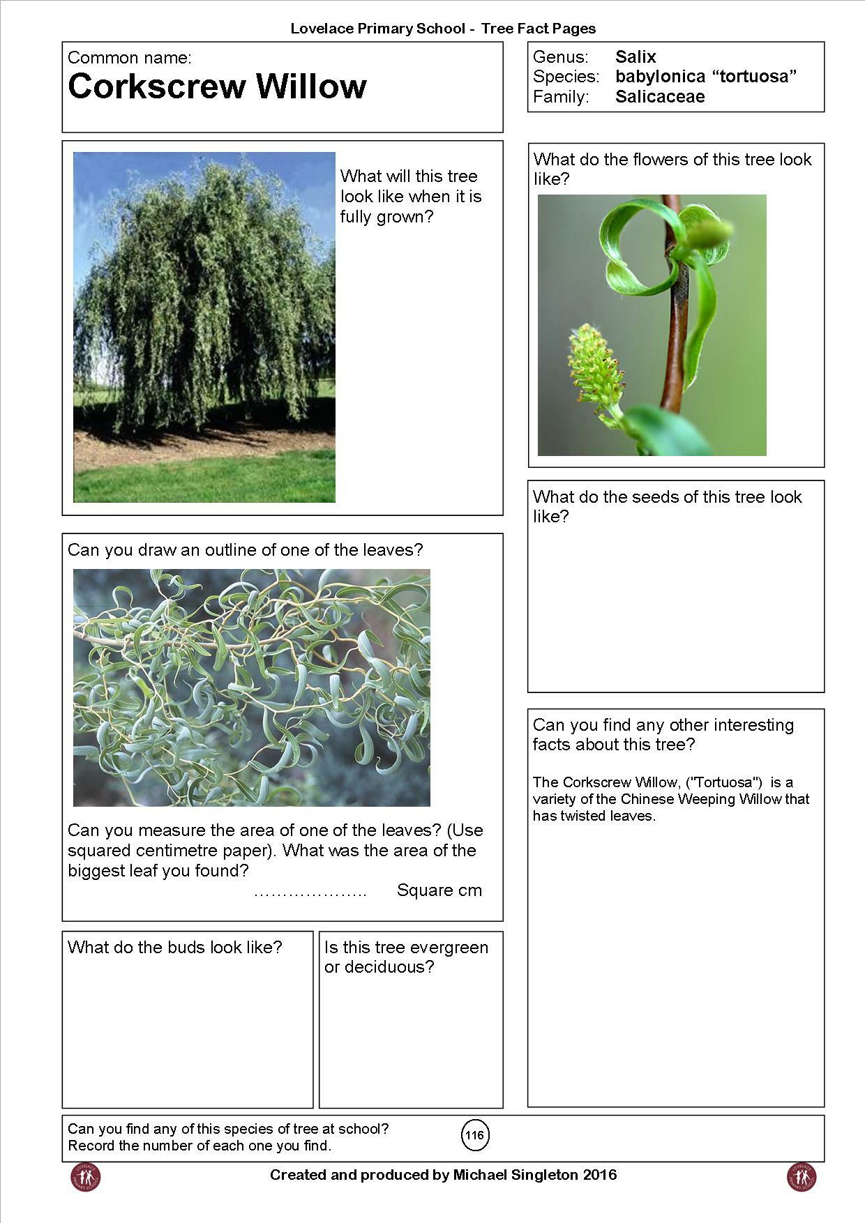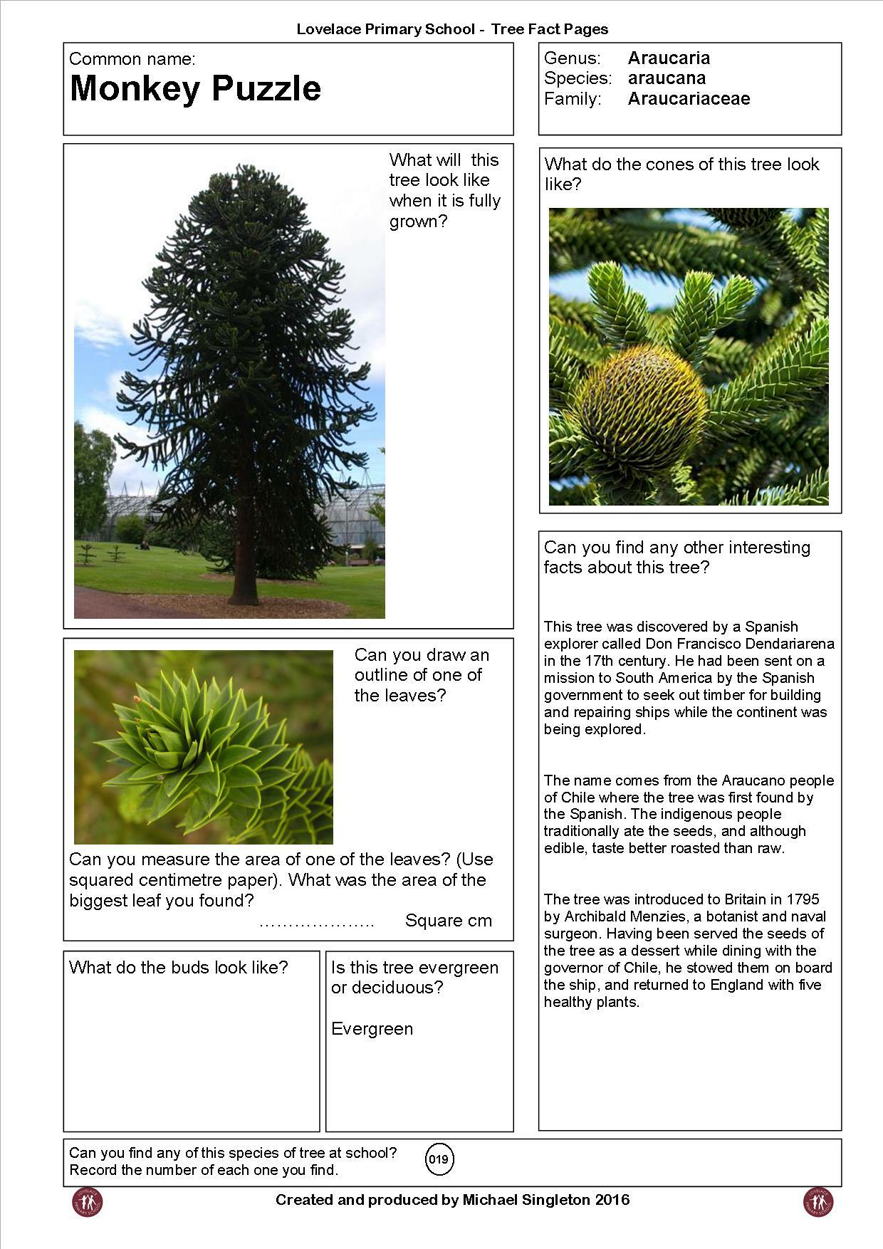 Each tree has been given a unique ID number printed on a white disc fixed to the trunk and the lists and map are kept updated in school by the premises manager. As a preview of this project we have listed a number of images of the fact pages children use as part of their outdoor learning.