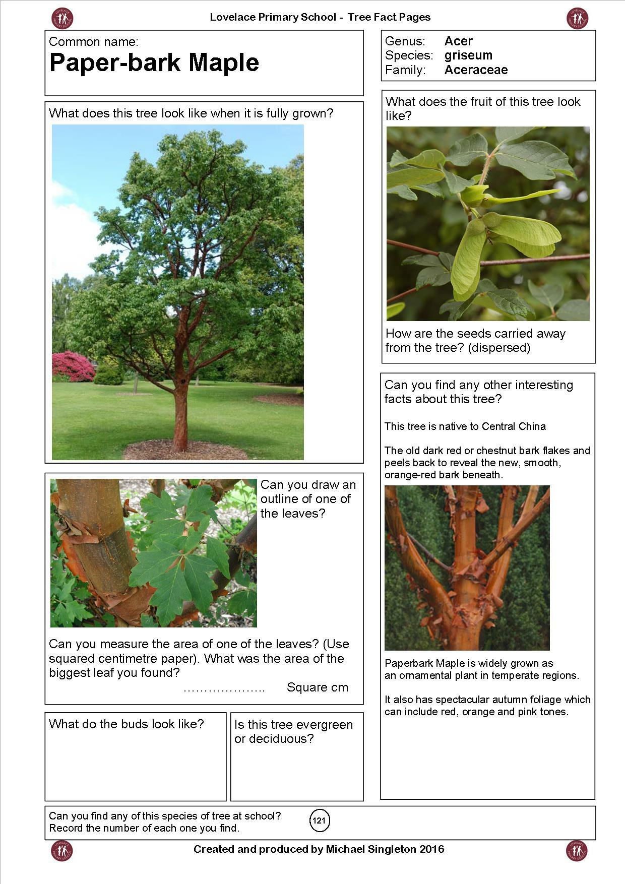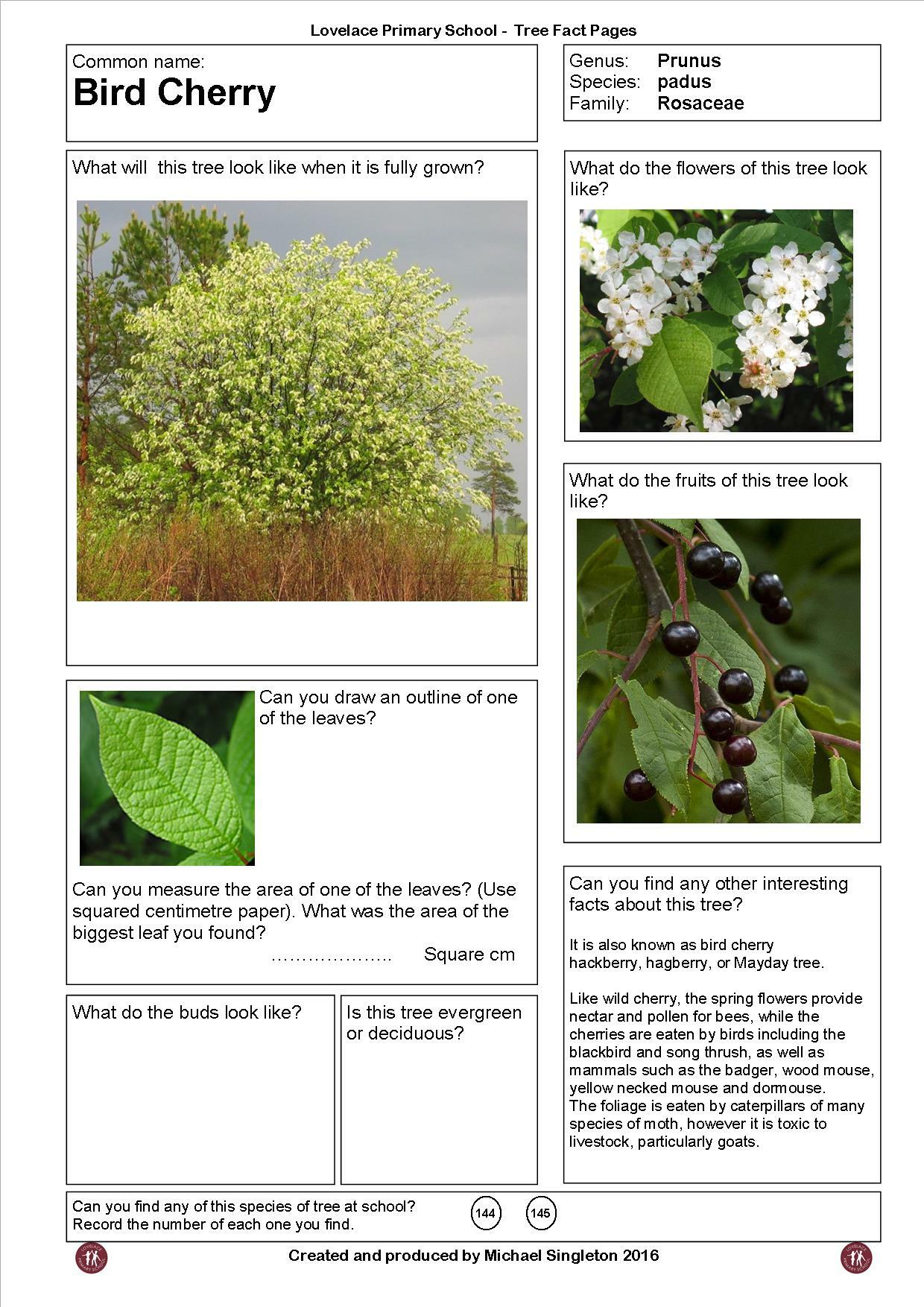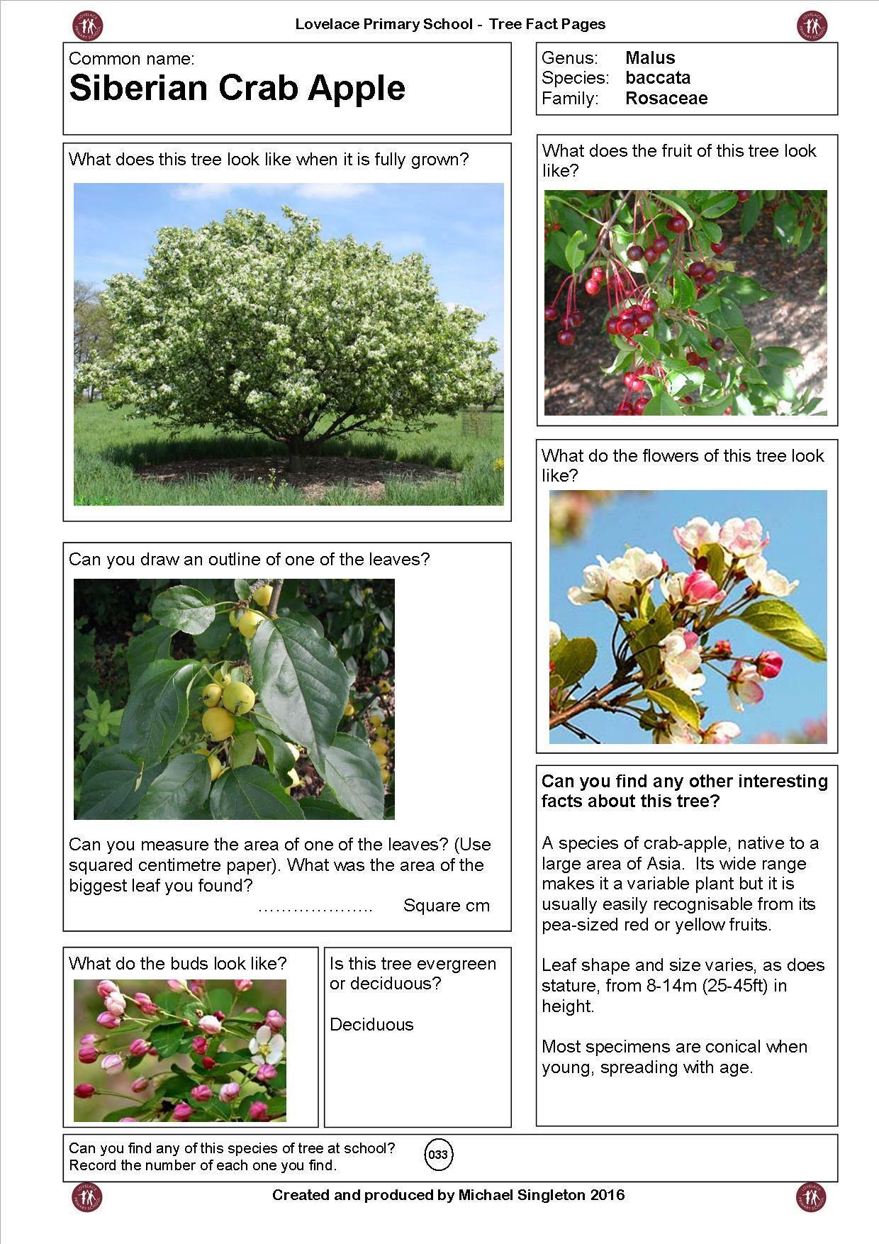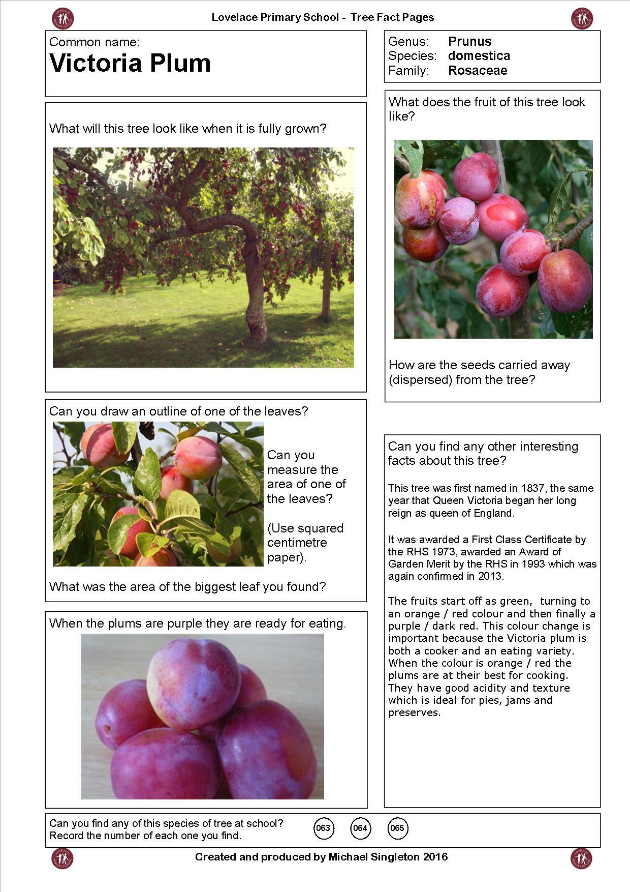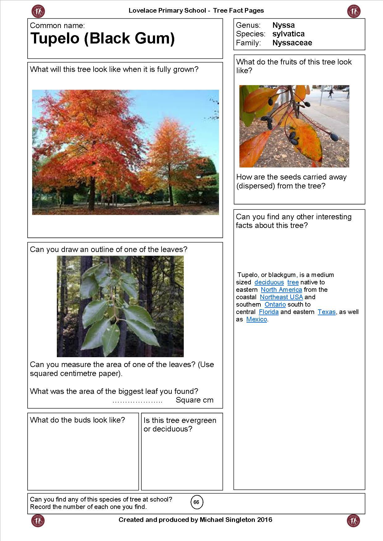 Each tree has been given a unique ID number printed on a white disc fixed to the trunk and the lists and map are kept updated in school by the premises manager. As a preview of this project we have listed a number of images of the fact pages children use as part of their outdoor learning.