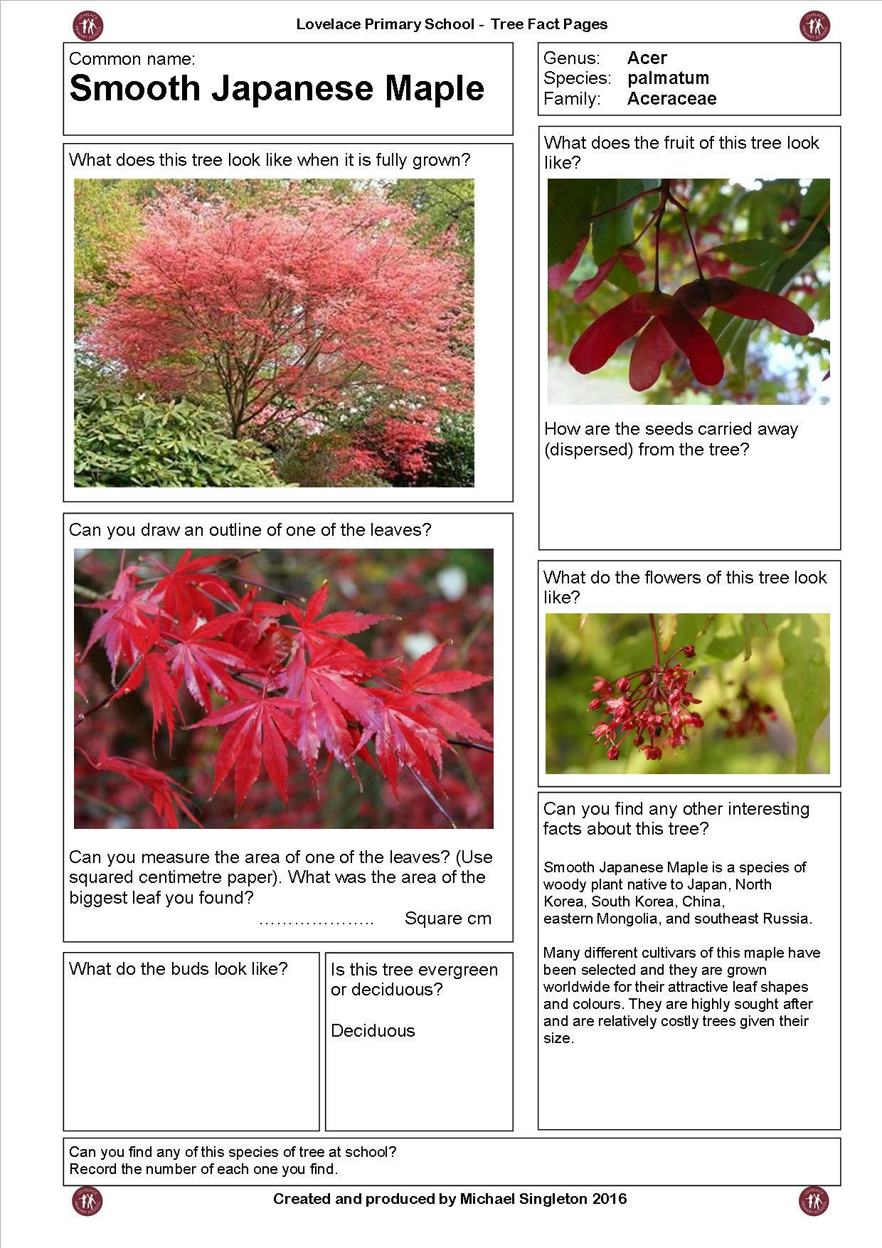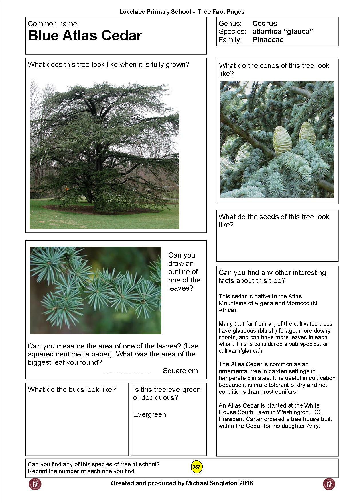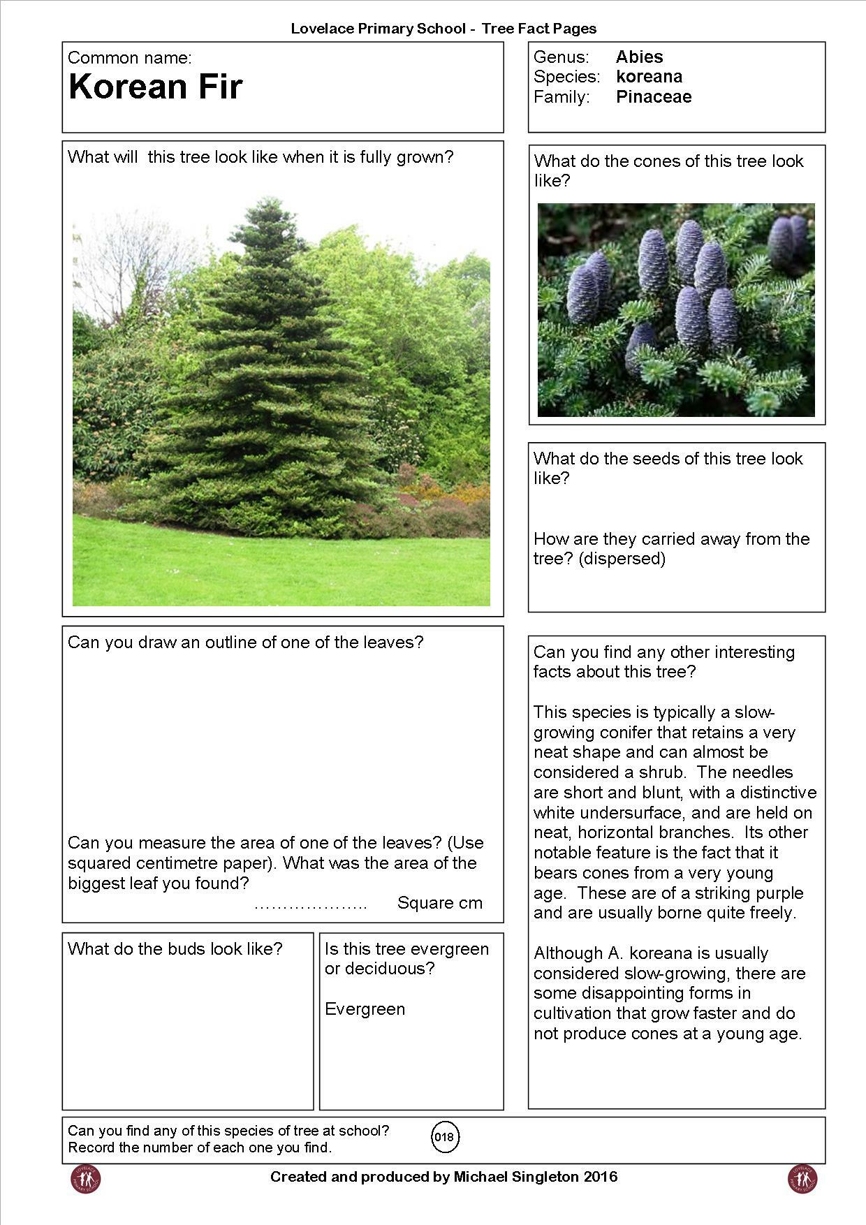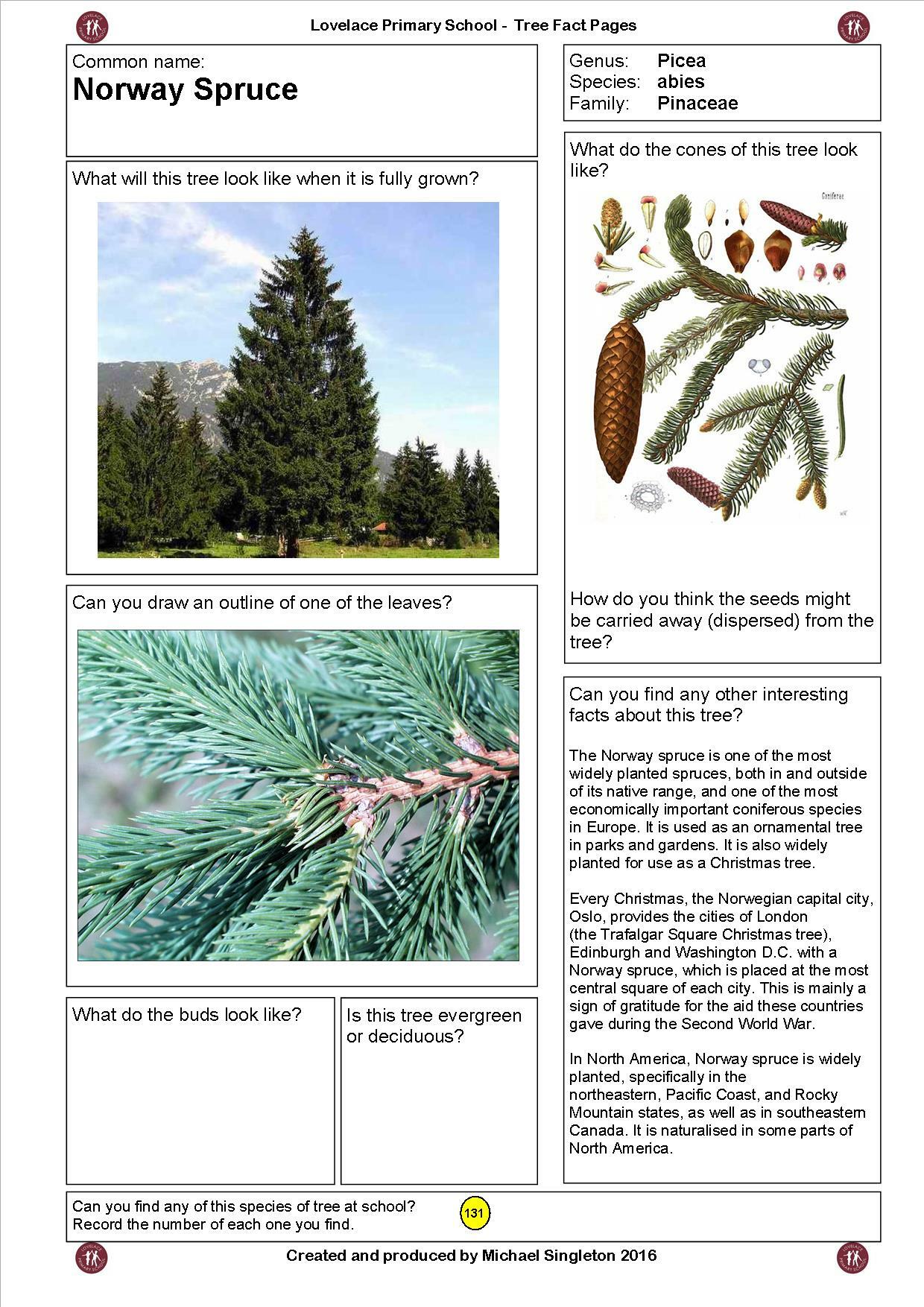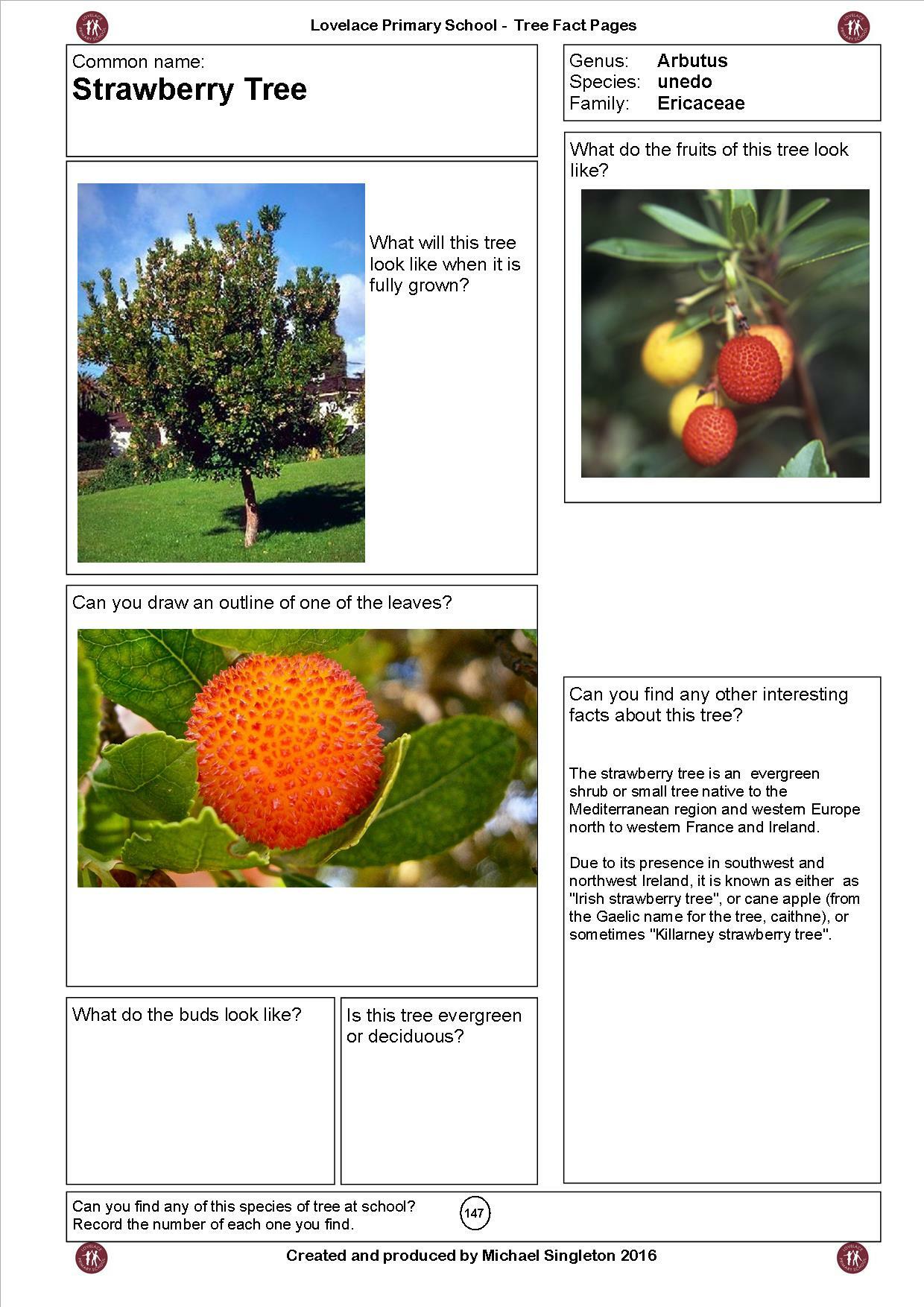 Each tree has been given a unique ID number printed on a white disc fixed to the trunk and the lists and map are kept updated in school by the premises manager. As a preview of this project we have listed a number of images of the fact pages children use as part of their outdoor learning.